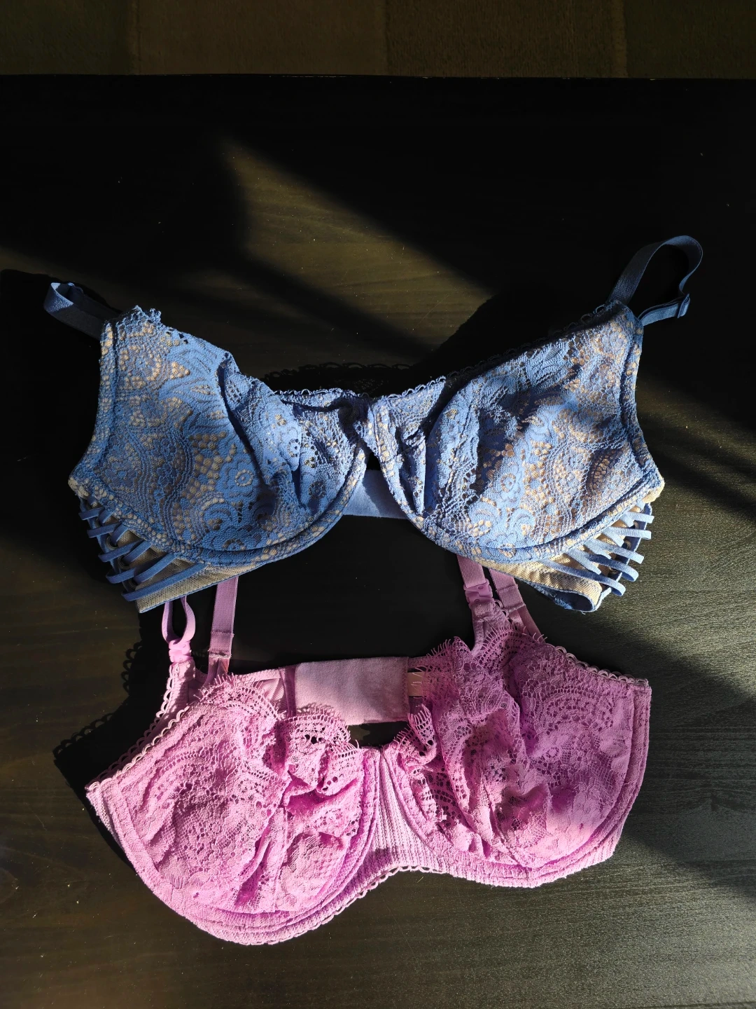 Victoria's Secret blue and a pink lace unpadded bra/bralettes. Both have underwires and adjustable straps. Lace detailing throughout.