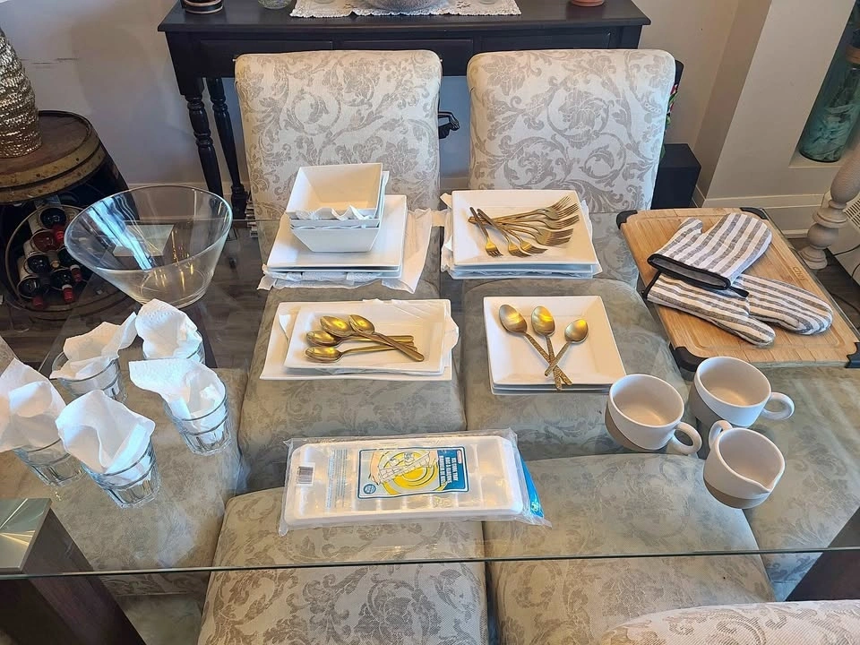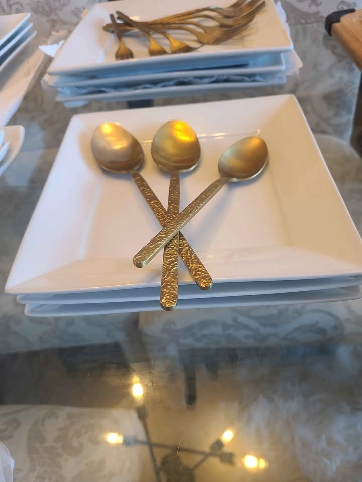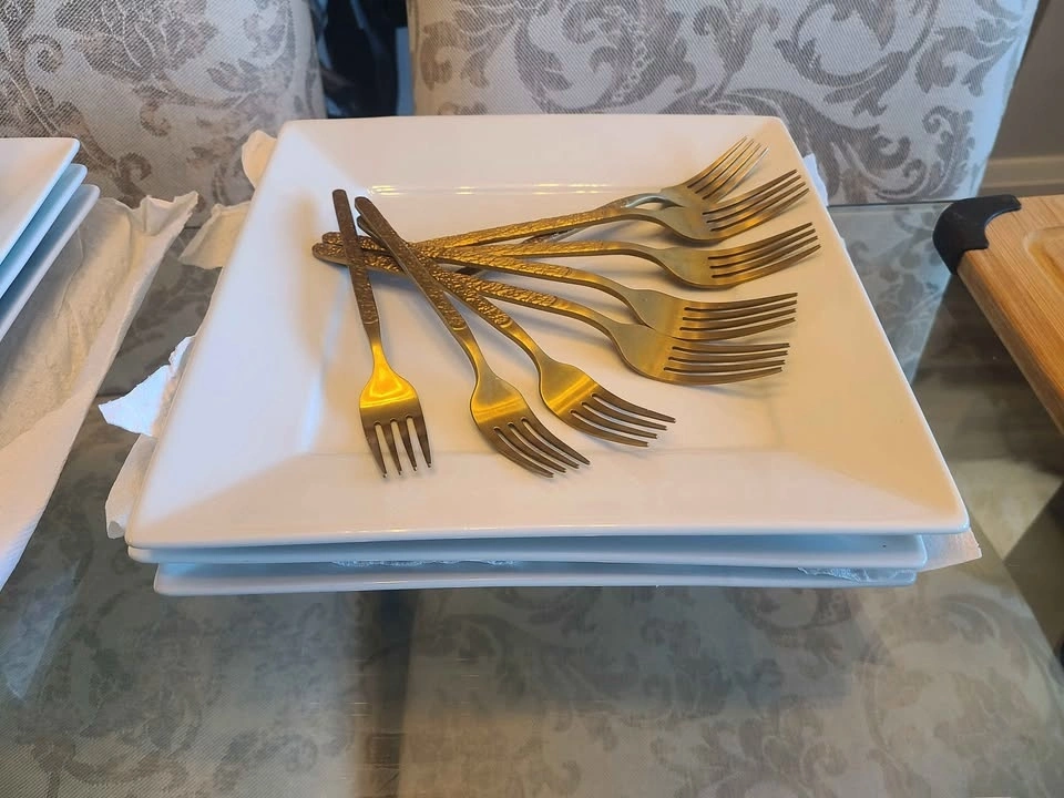 Up for sale is a beautiful dinnerware set with square plates, golden cutlery, water glasses, and much more. Everything you see in the pictures and video is included. Pickup is available at 2310 Derry Road West, Mississauga, ON L5N 2R4. Feel free to message if you have any questions!