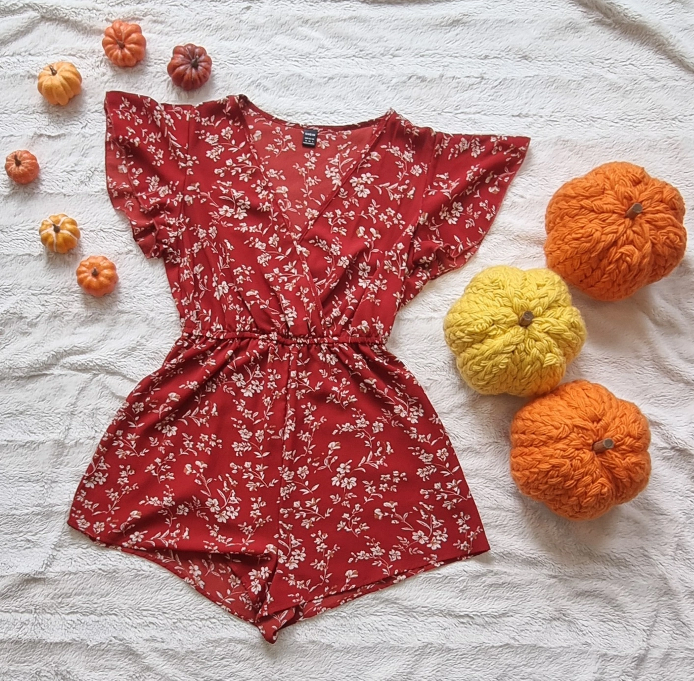Red floral romper with short sleeves and a V-neck. It has a stretchy waist. It is a lightweight and flowy fabric. The romper is great for heading out to the beach, for date nights, and for short hikes in the summer. This romper looks great with a denim jacket and sneakers!