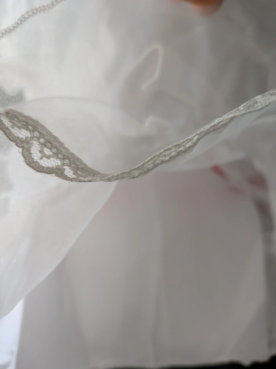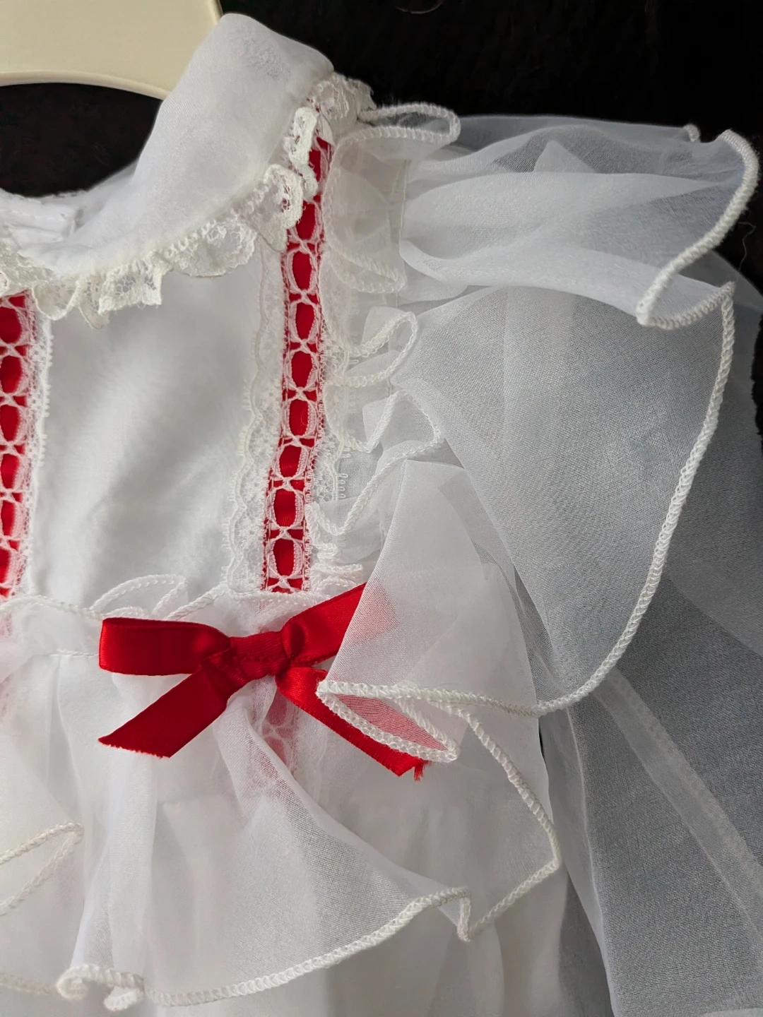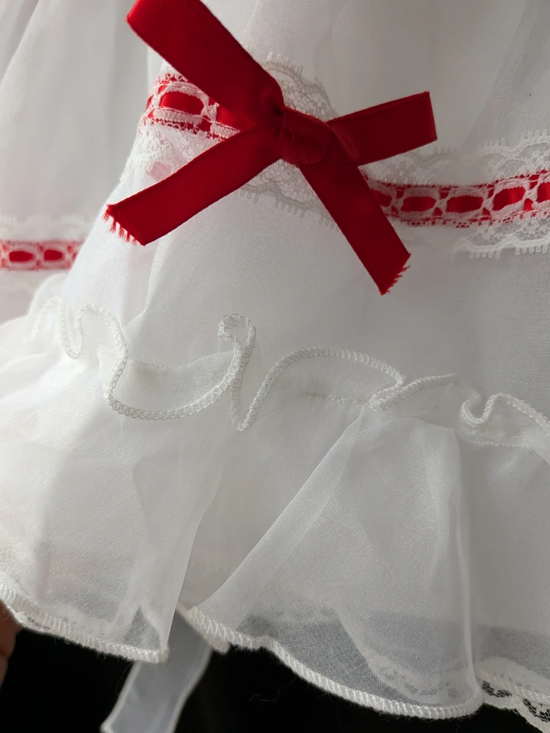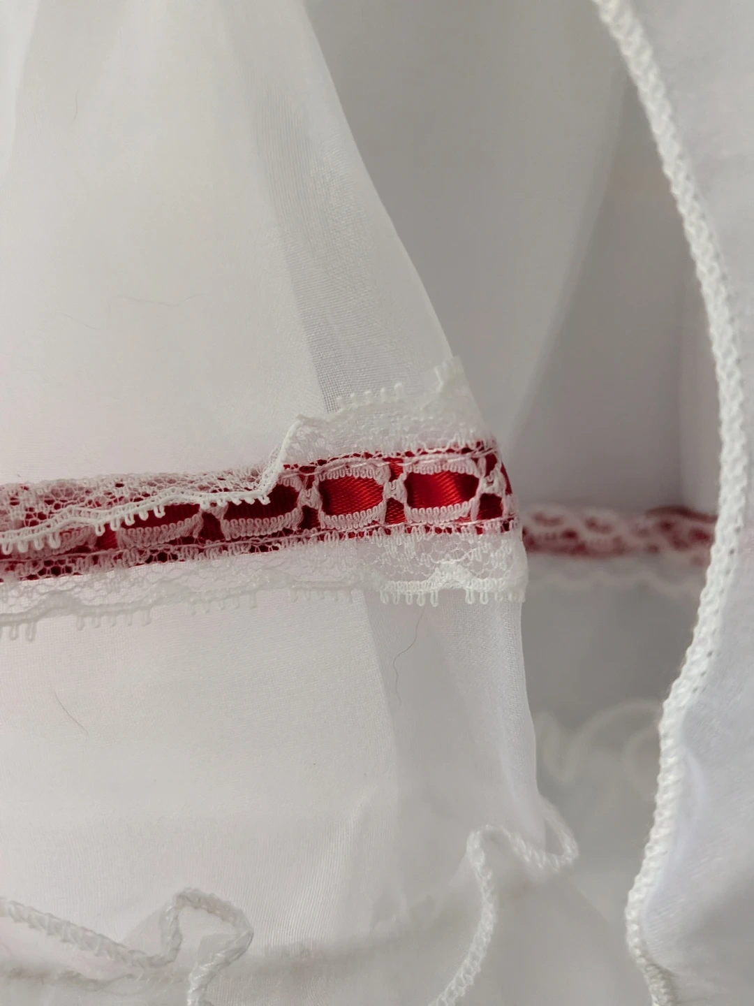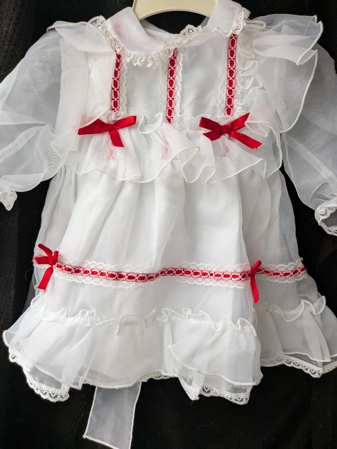 A cute vintage baby white dress from the 70's - 70's era featuring red bow accents! It's in great condition and perfect for a special occasion or just a fun day out. The dress has a layered, ruffled design with sheer fabric and delicate lace detailing.