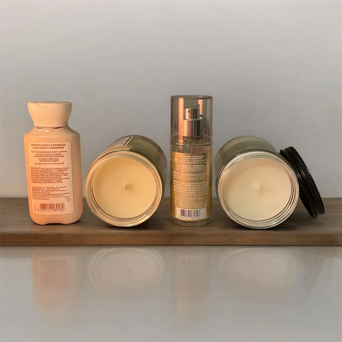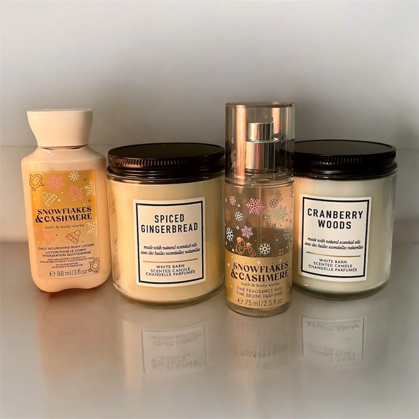 This Bath and Body Works gift set includes Snowflakes & Cashmere travel sized body lotion and fine fragrance mist, and two winter-themed single wick white barn candles- Cranberry Woods and Spiced gingerbread