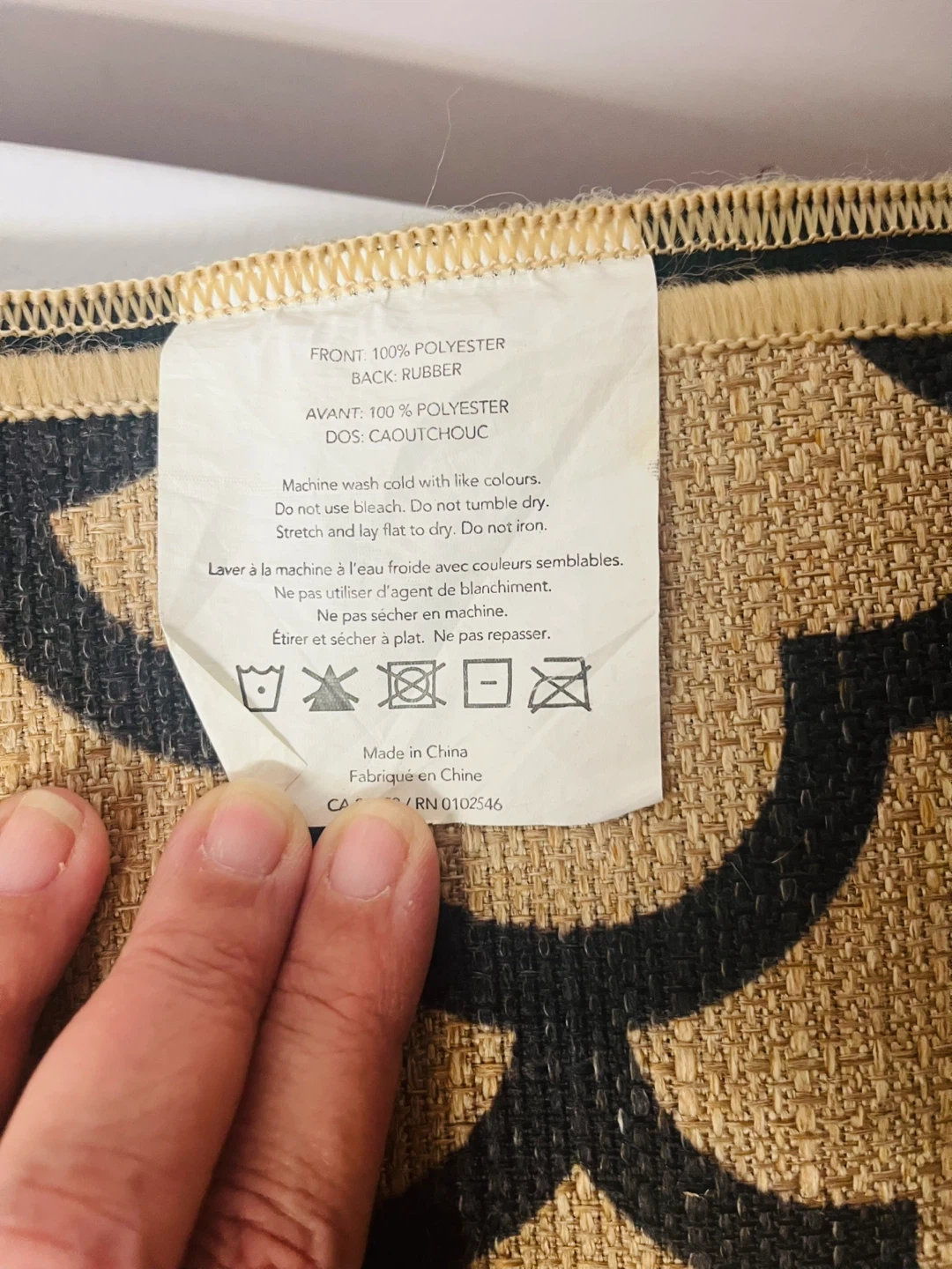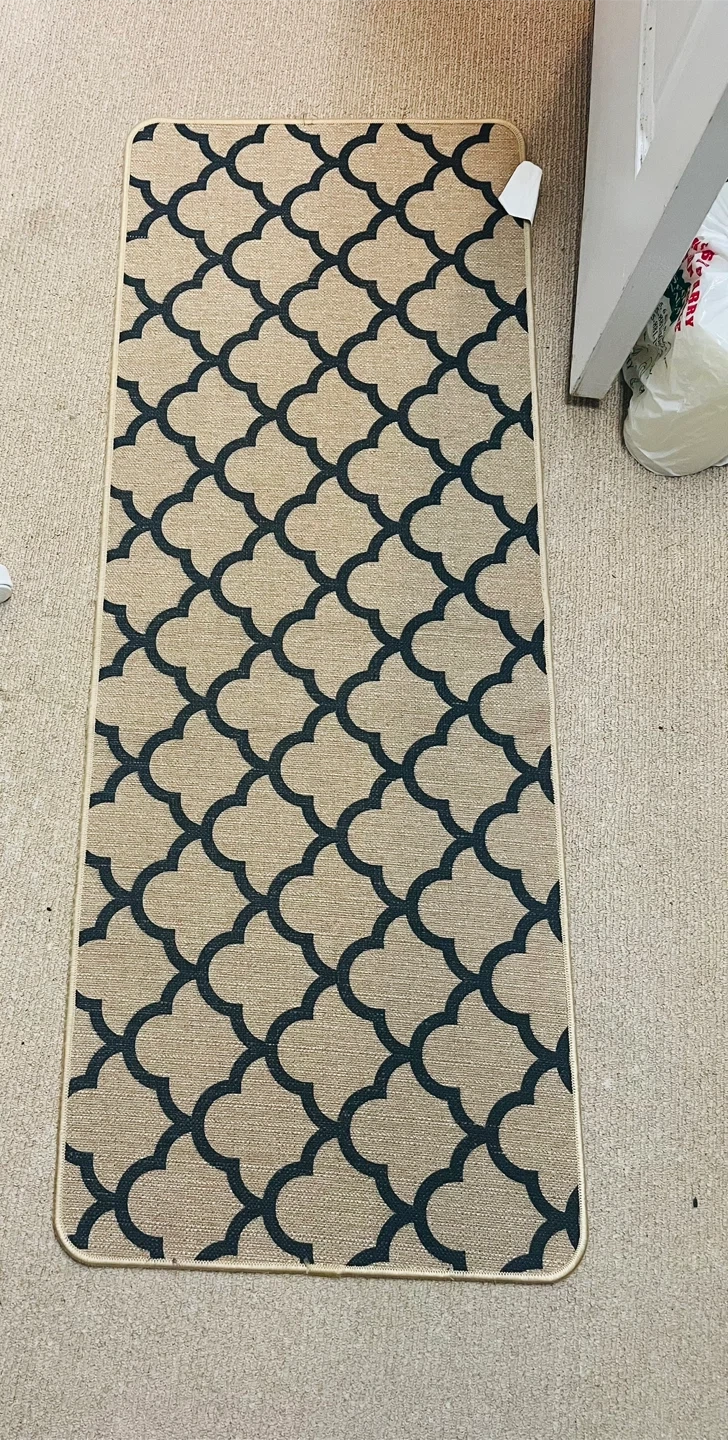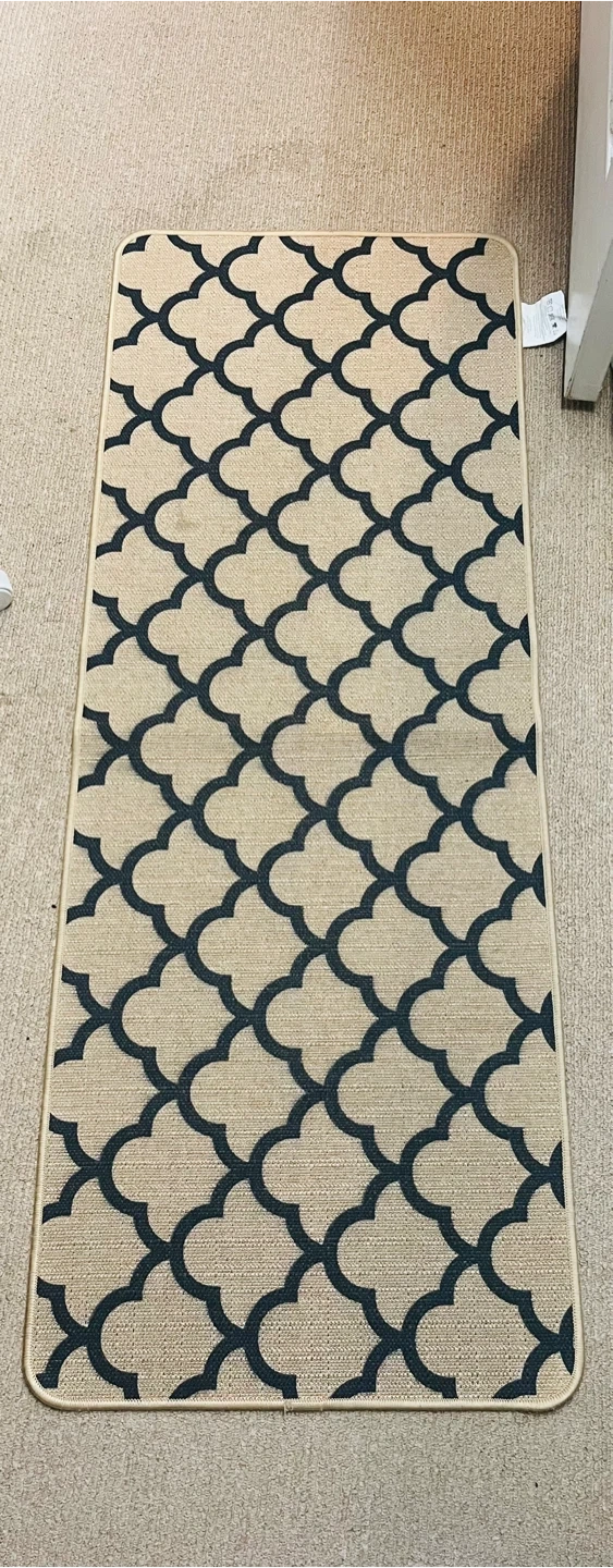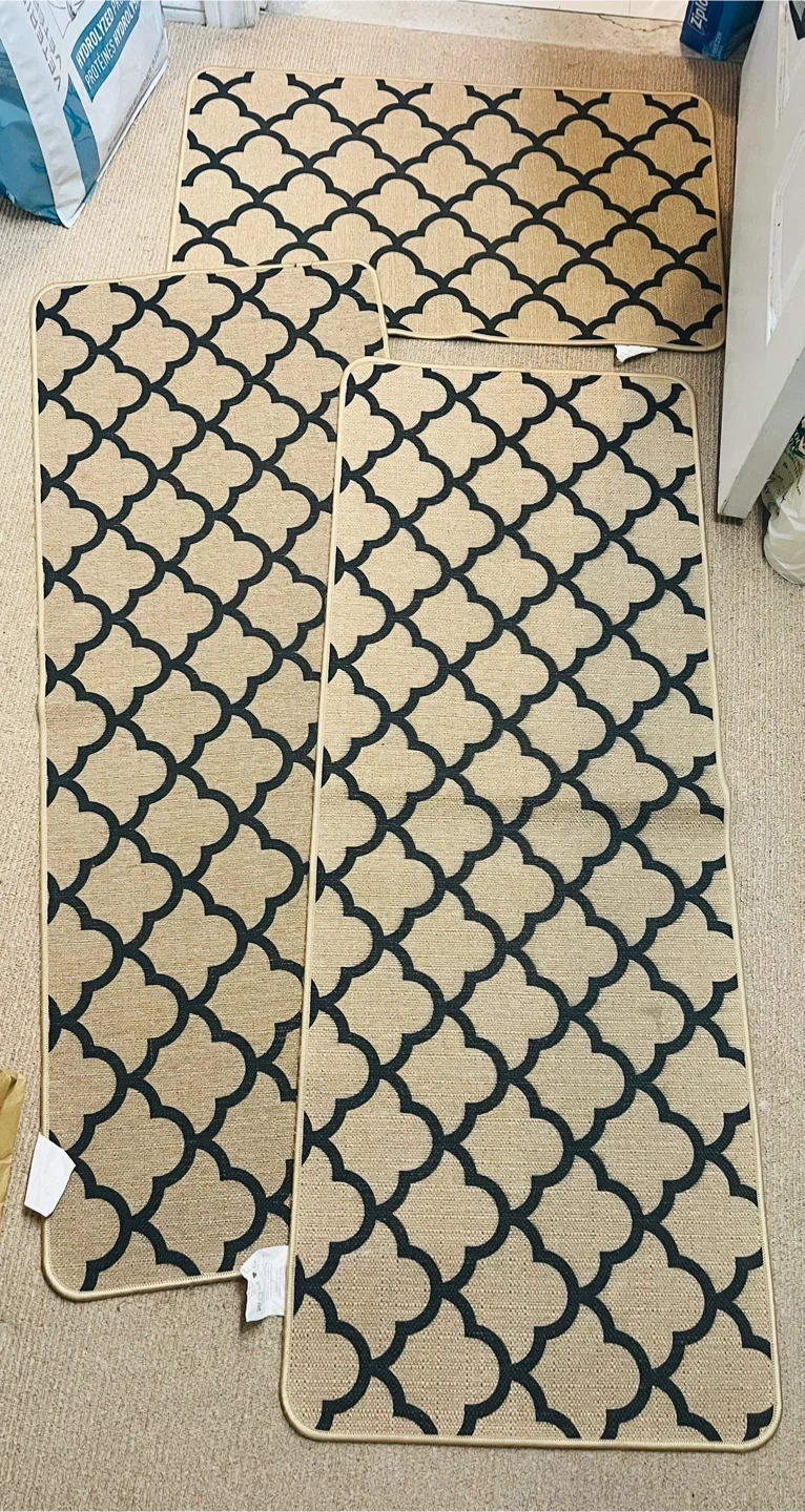 Set of three beige and black polyester mats with a modern trellis pattern. They’re great for winter weather because they protect your floors from snow, salt and moisture. All three are brand new and never used. Easy to clean and perfect for the kitchen, entryway or mudroom. 40$ for the set of 2 long and 1 small mats.