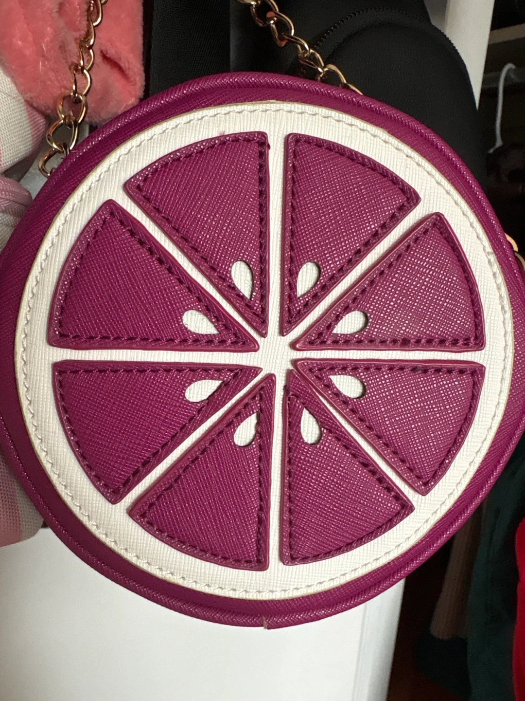 This fun round crossbody bag features a purple orange slice design.
