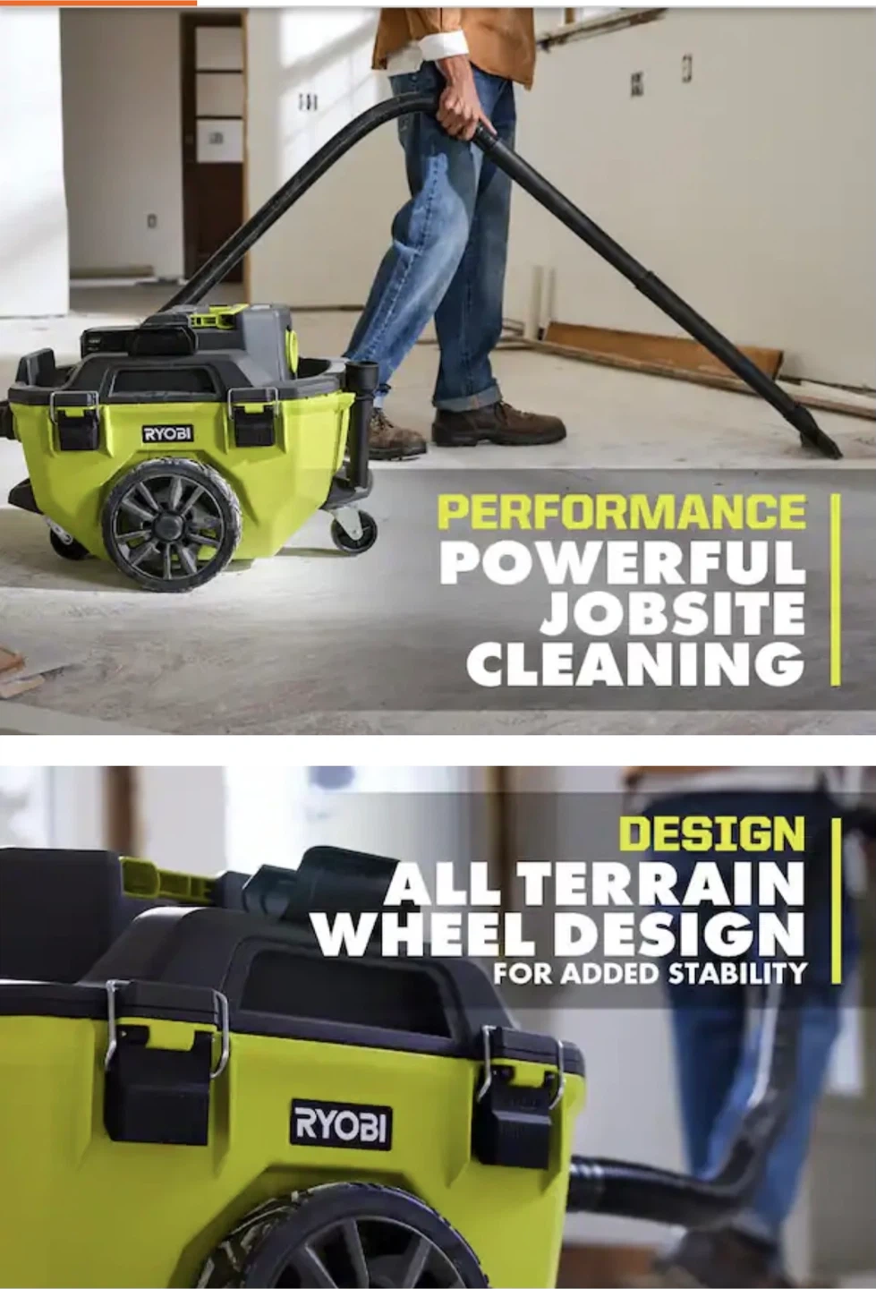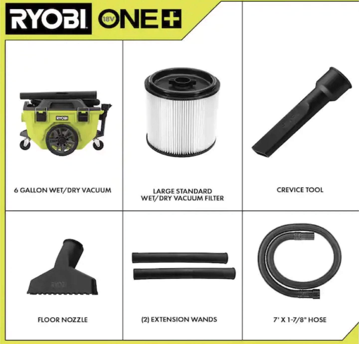 This Ryobi ONE+ 18V wet/dry vacuum has a 6-gallon capacity. It includes a 7' x 1-7/8" hose, crevice tool, floor nozzle, (2) extension wands, and a large standard wet/dry vacuum filter. Features collapsible handle, flat top design, and all-terrain caster wheels. (TOOL ONLY)