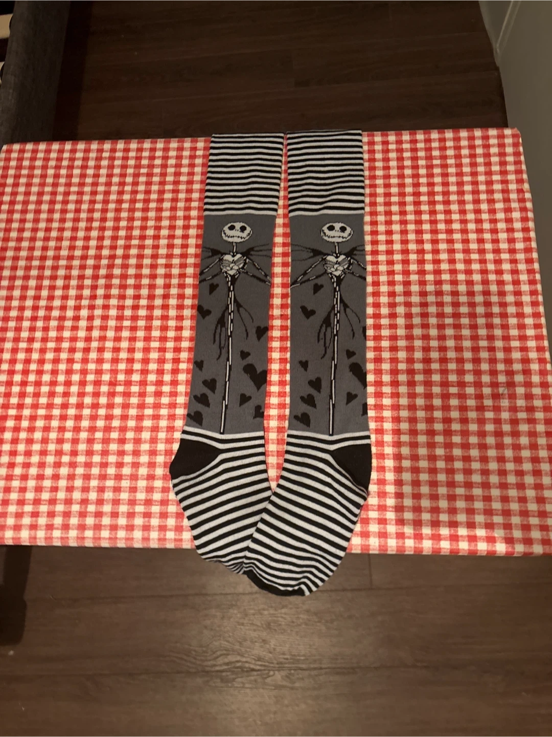 Fun knee-high socks featuring Jack Skellington from The Nightmare Before Christmas. They have black and white stripes and grey panels with hearts and images of Jack. One size fits most.