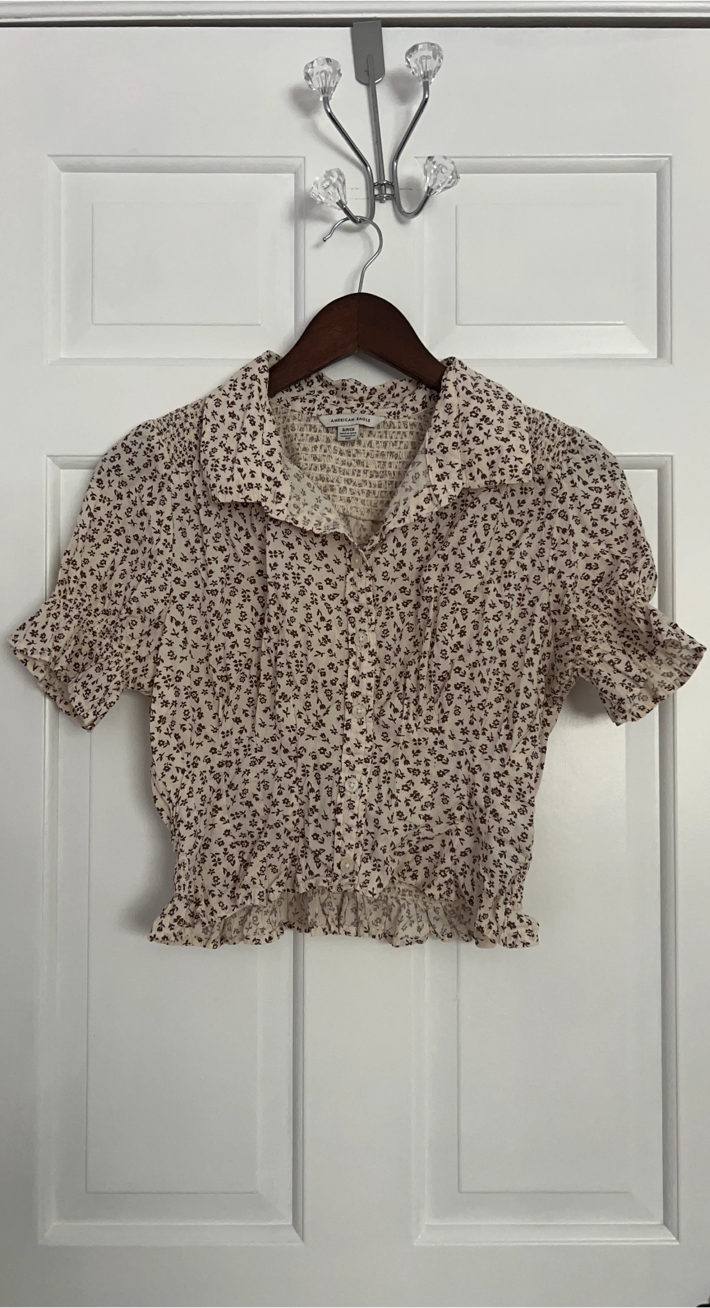 This is an American Eagle top with a ditsy floral print. It features a smocked bodice and puff sleeves with elastic cuffs. It's a cropped style with a ruffled hem.