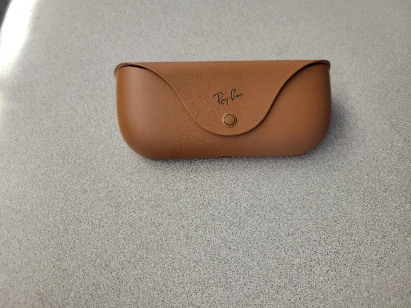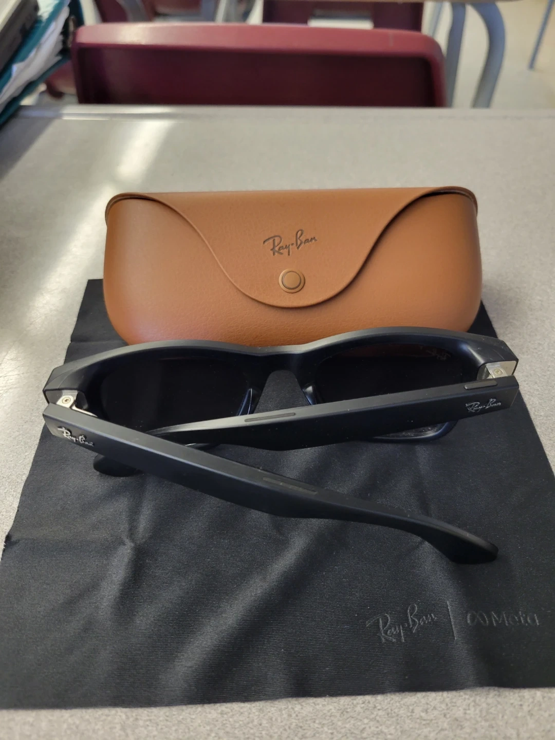 These are Ray-Ban Stories Wayfarer smart glasses. They feature a black frame and come with a brown charging case. This pair includes the original cleaning cloth. Capturing photos and videos hands-free is easy!