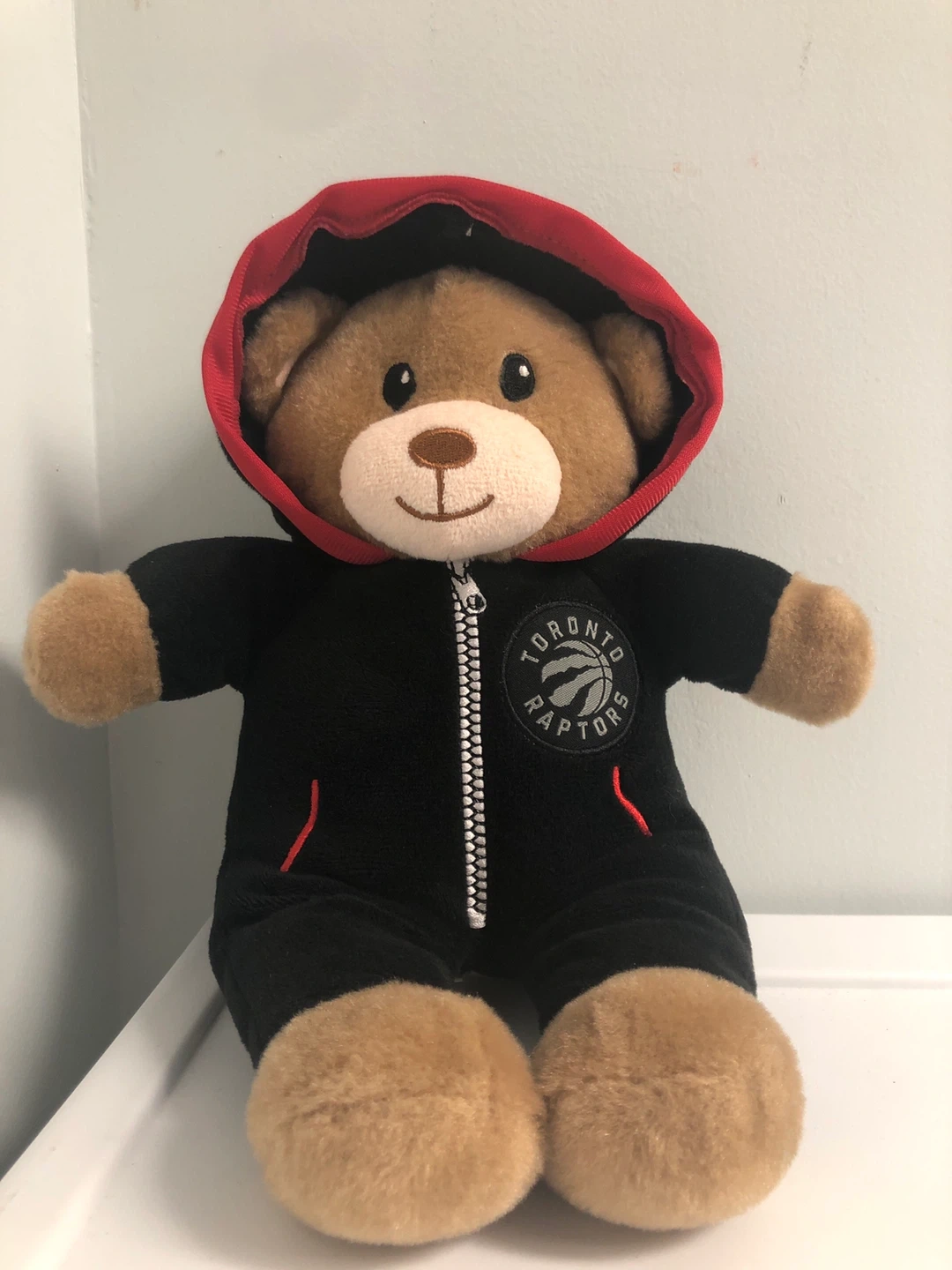 This is a soft teddy bear dressed in a black Toronto Raptors tracksuit with a red hood. It features the team's logo on the front. The tracksuit has a zipper closure.