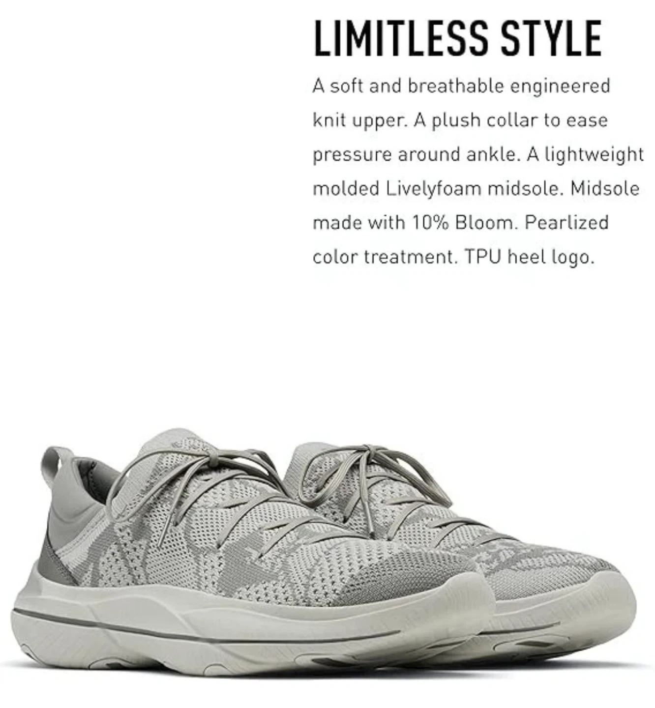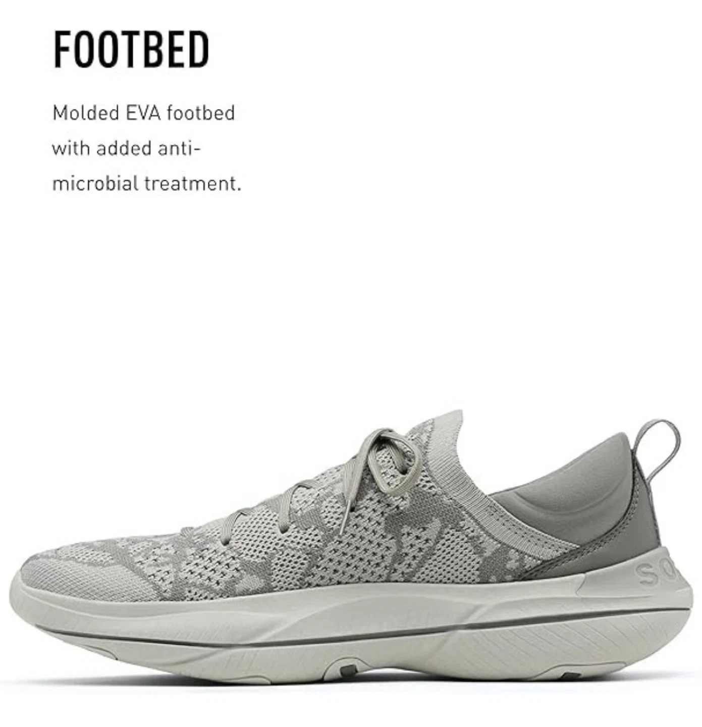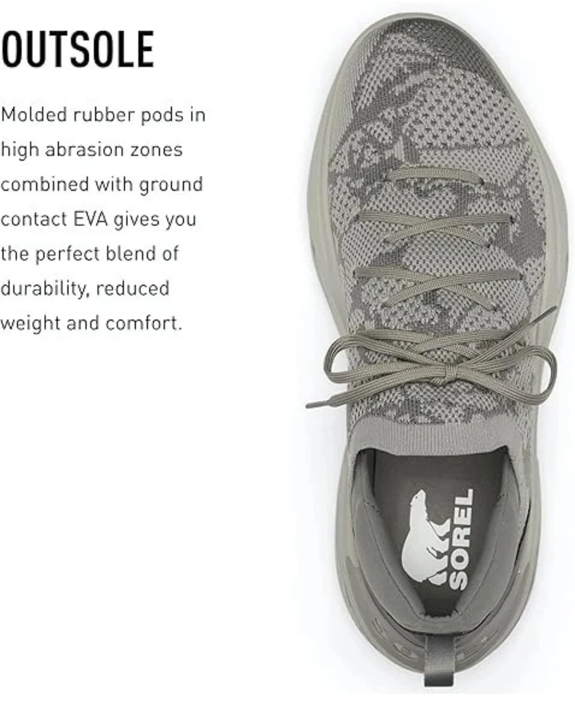 These Sorel sneakers boast a soft, breathable engineered knit upper and a plush collar for ankle comfort. They feature a lightweight Livelyfoam midsole made with 10% Bloom and molded rubber pods in high-abrasion zones for durability and traction. The molded EVA footbed has an added anti-microbial treatment.