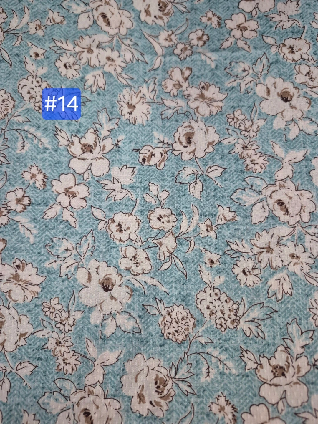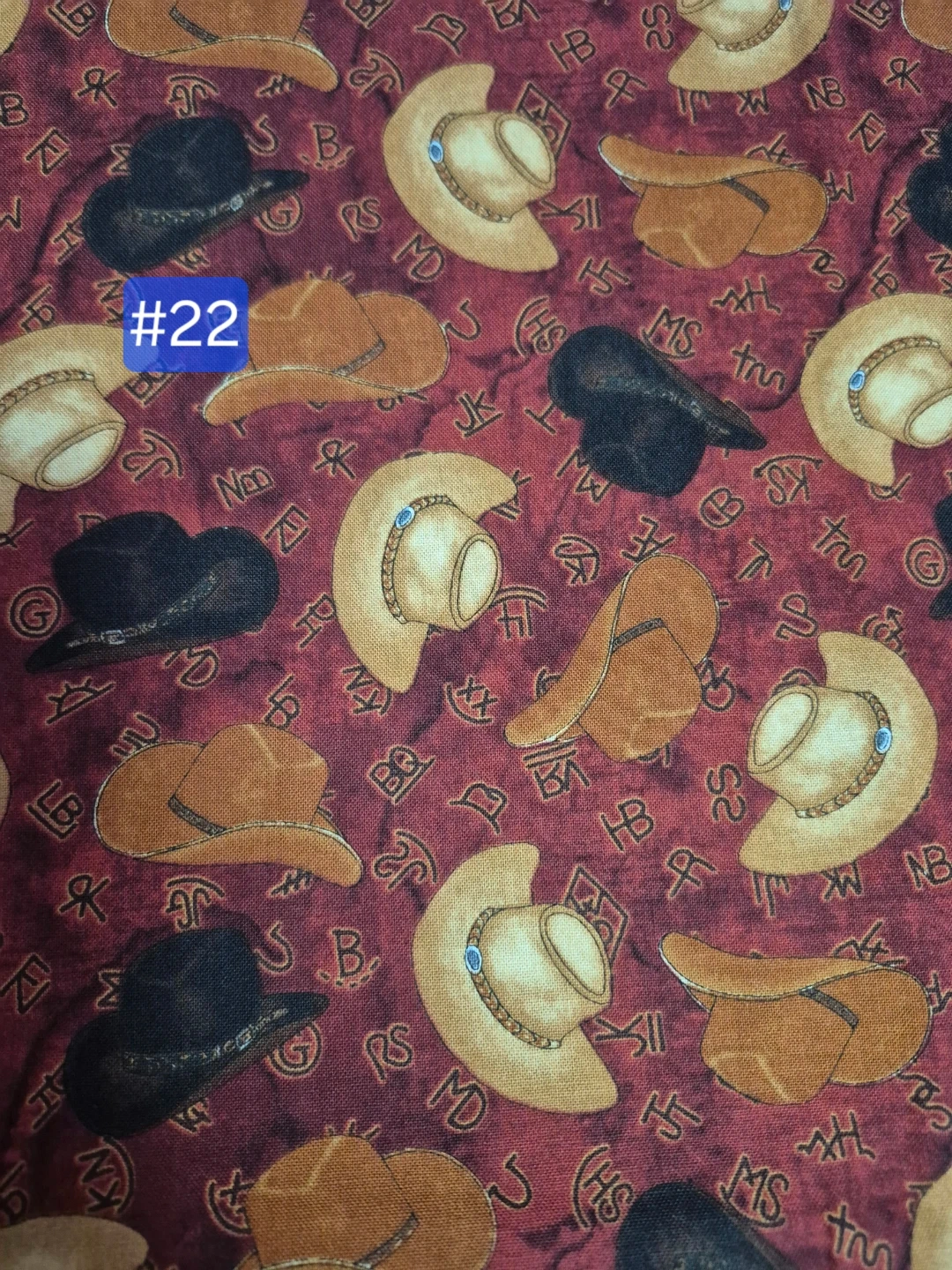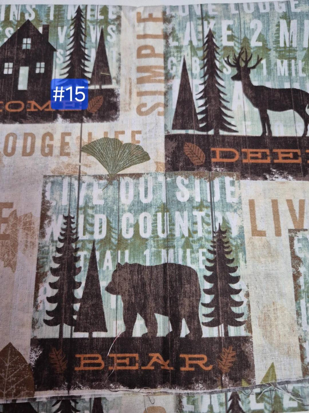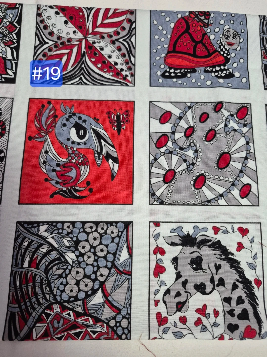 A collection of assorted fabric prints including floral, mannequins, and animal designs. Great for crafting and sewing projects!