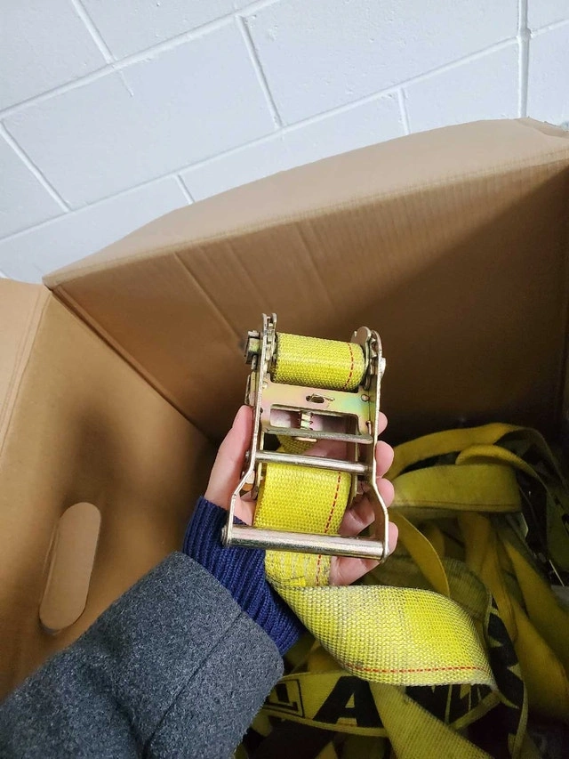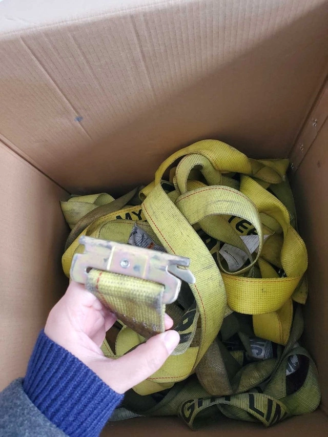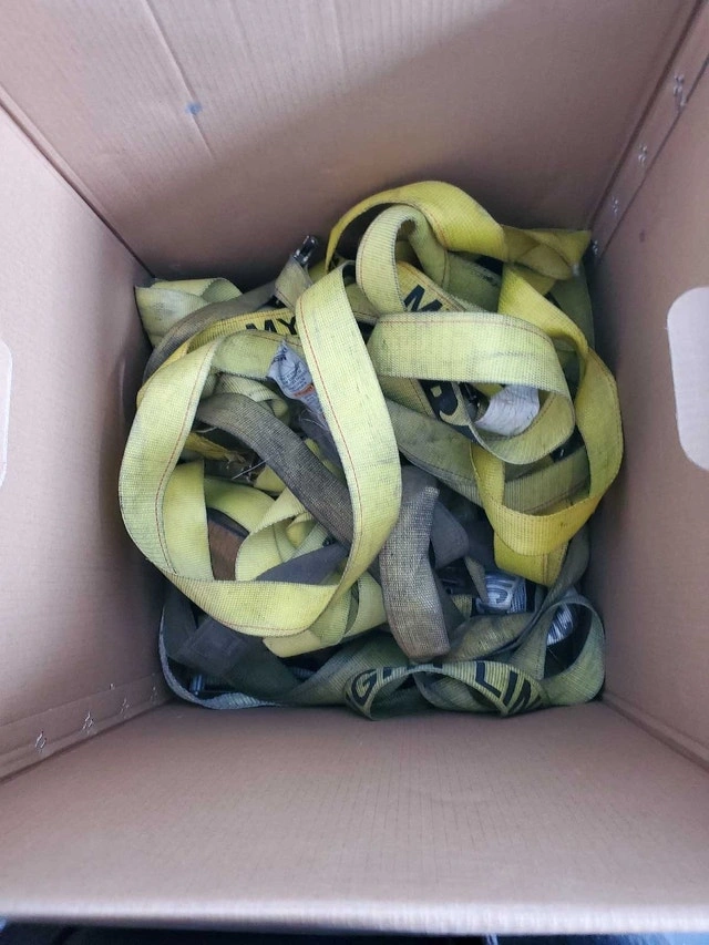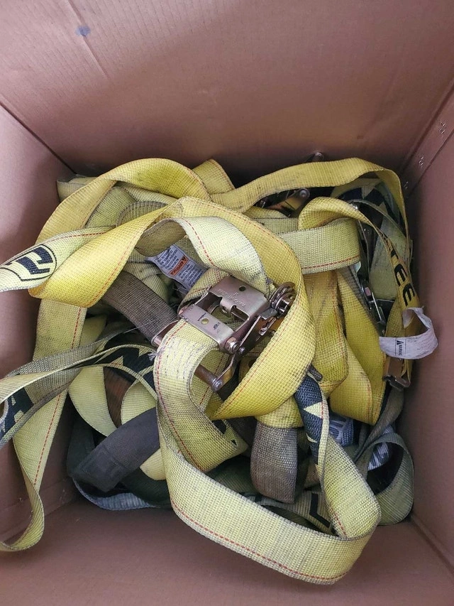 Selling a box of used truck ratchet straps, perfect for securing cargo. These straps have been used but are still in good working condition. They're ready to help you get your load safely to its destination! Features durable material, a ratchet mechanism for secure tightening, and various lengths and sizes. Selling the whole box for a steal! If the ad is up, the straps are still available.