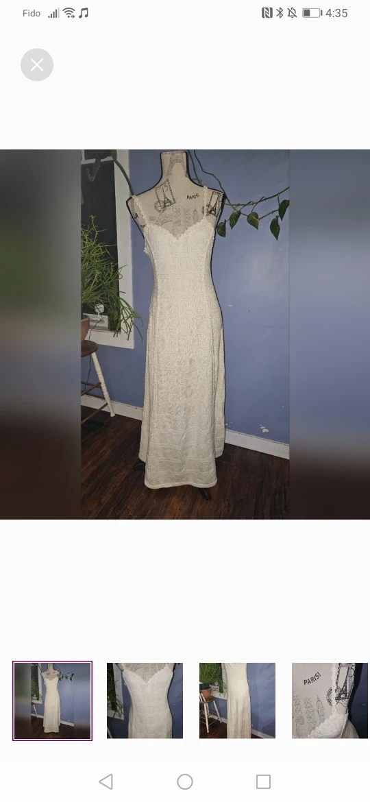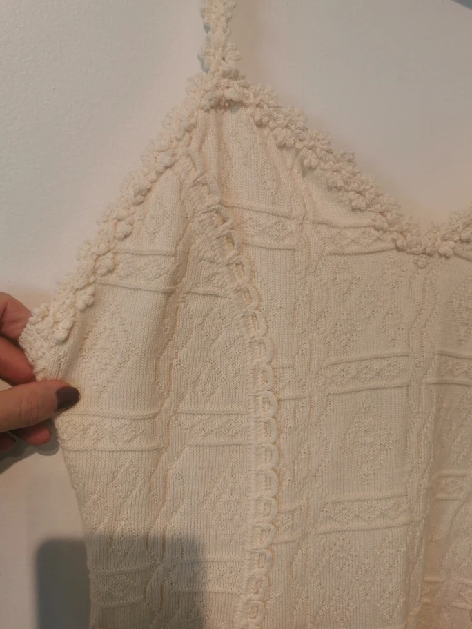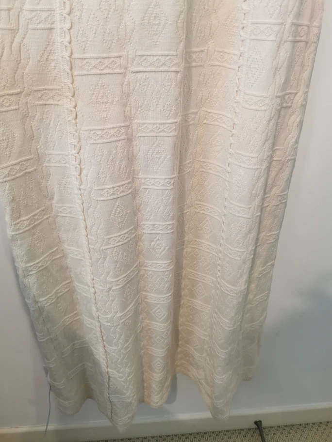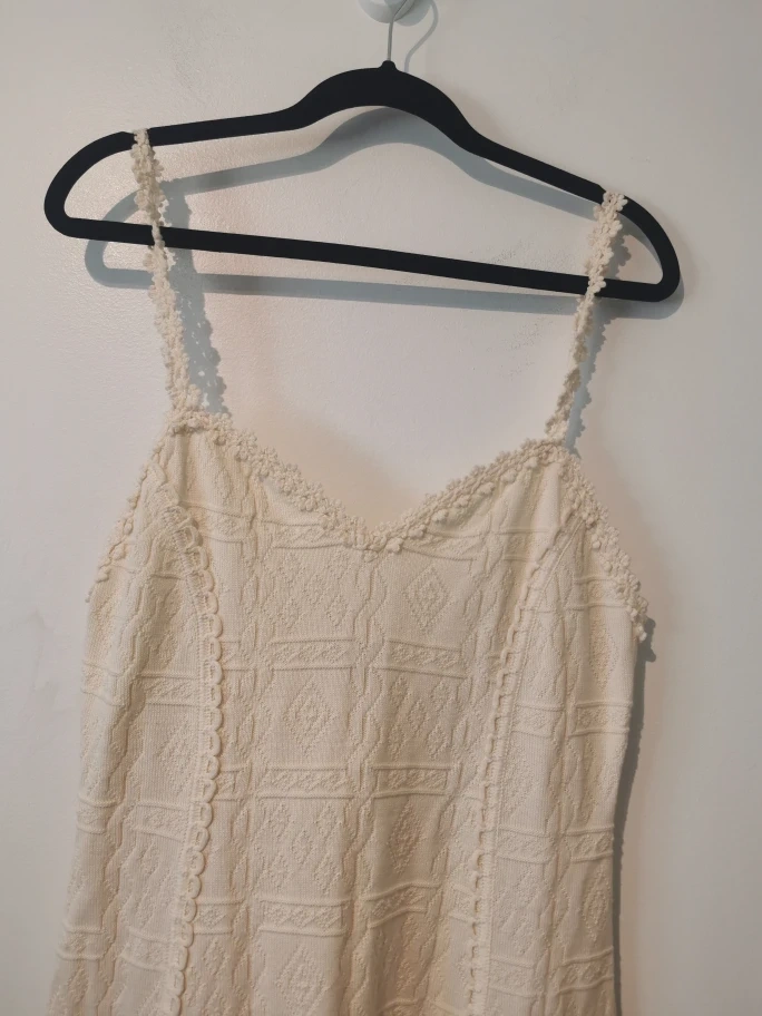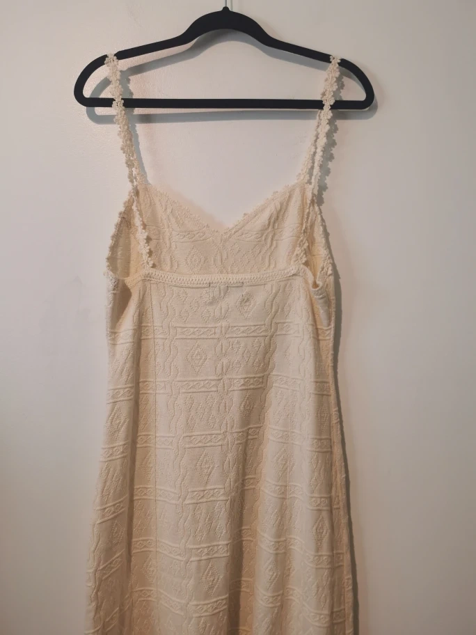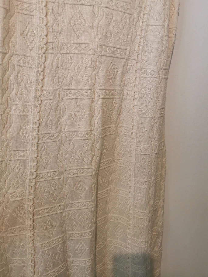 Here's a lovely cream-coloured knit dress! It's in great condition and ready for a new home. The knit pattern is really pretty and gives it a unique look