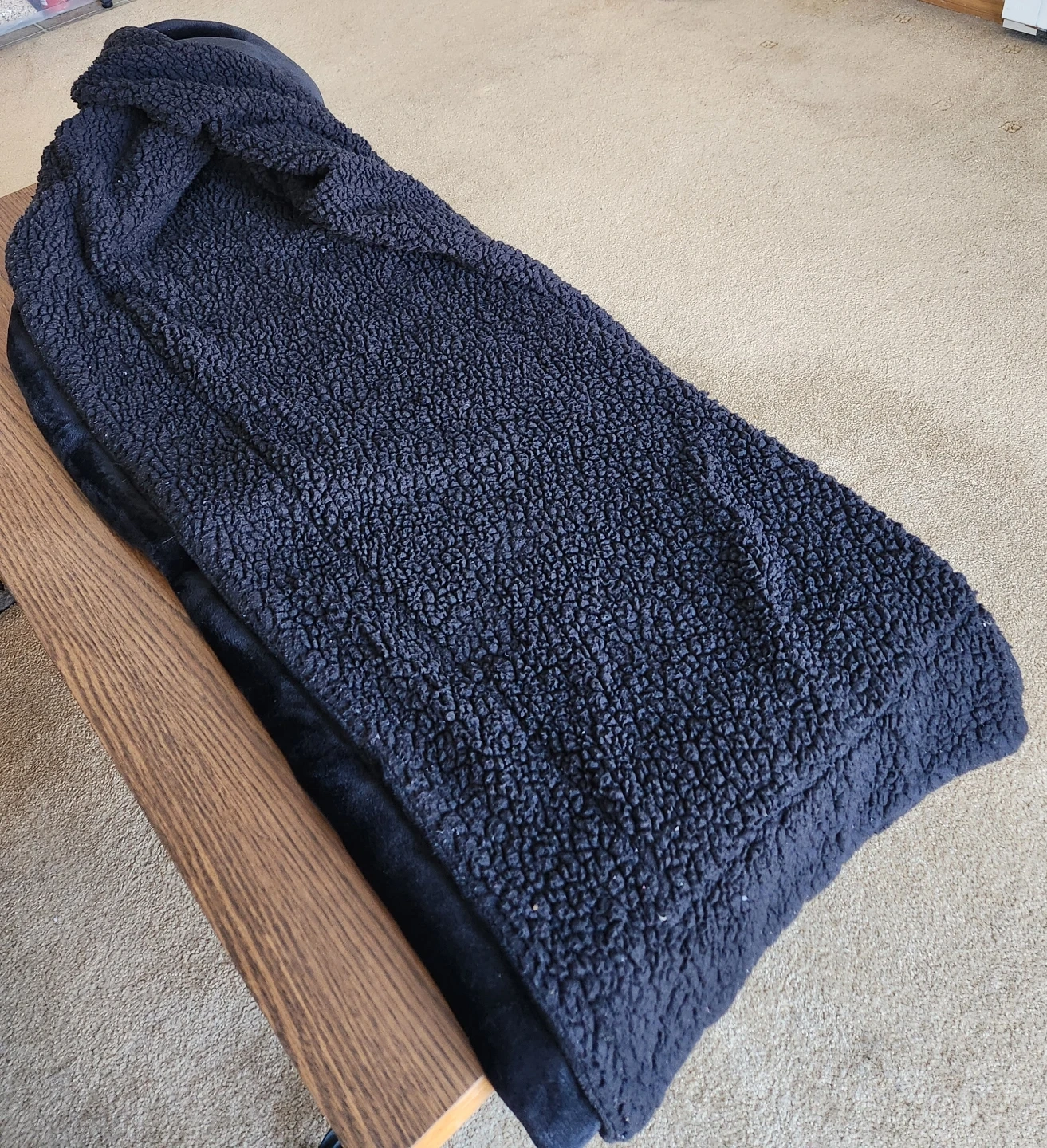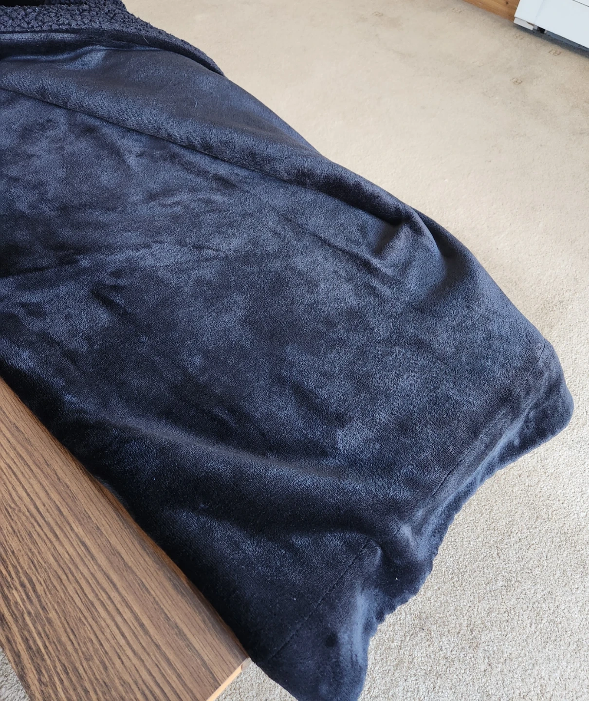 Soft and warm with a fluffy texture on one side and smooth fleece on the other. Great for staying warm on chilly nights!