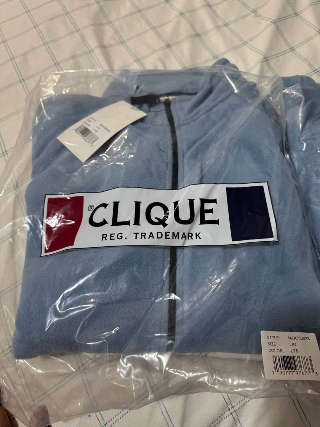 Light blue Clique fleece jacket. Size L/G. Features a full-zip front and zippered pockets. Pickup in Wellesley street east