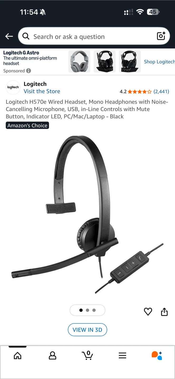 Logitech H570e mono USB headset with microphone. It has a USB-A connector and inline controls. Great for online meetings and calls!