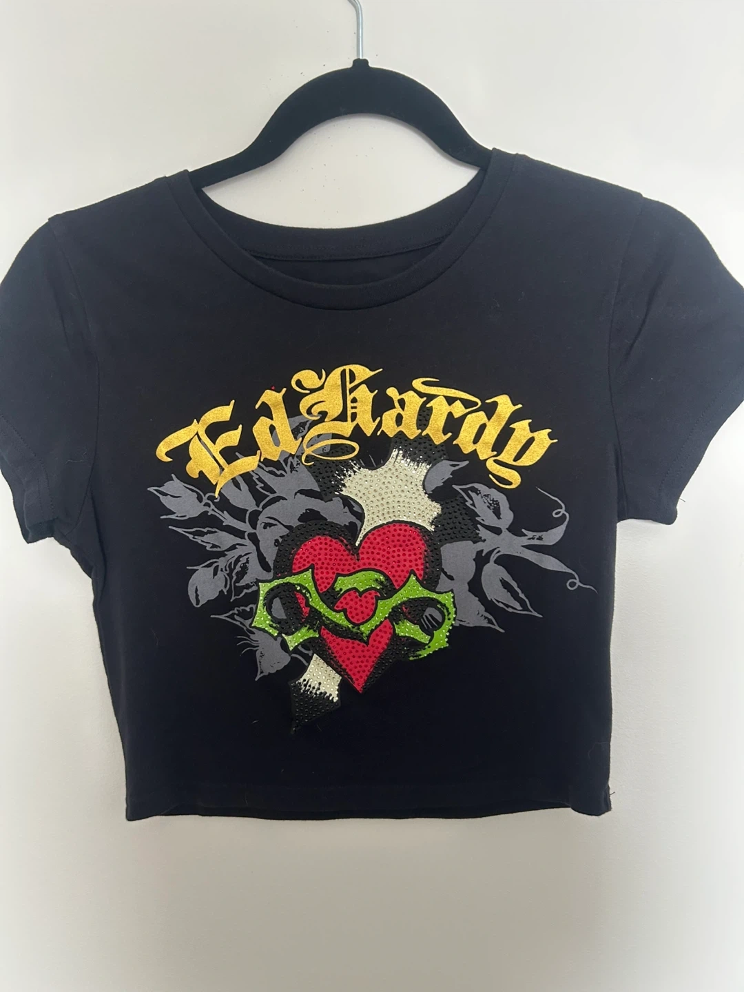This is a black Ed Hardy cropped t-shirt. It features a graphic print with rhinestones and a heart design. Made from a comfortable cotton blend material.
