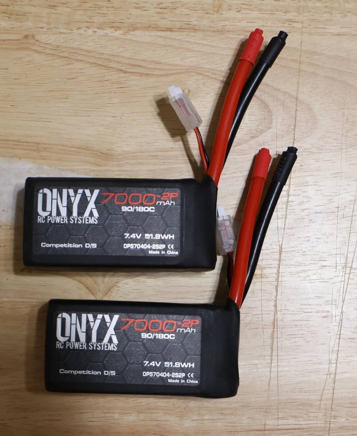 Two Onyx 7000mAh 2S LiPo batteries. Competition D/S model with 7.4V and 51.8WH. Specs include 90/180C rating.