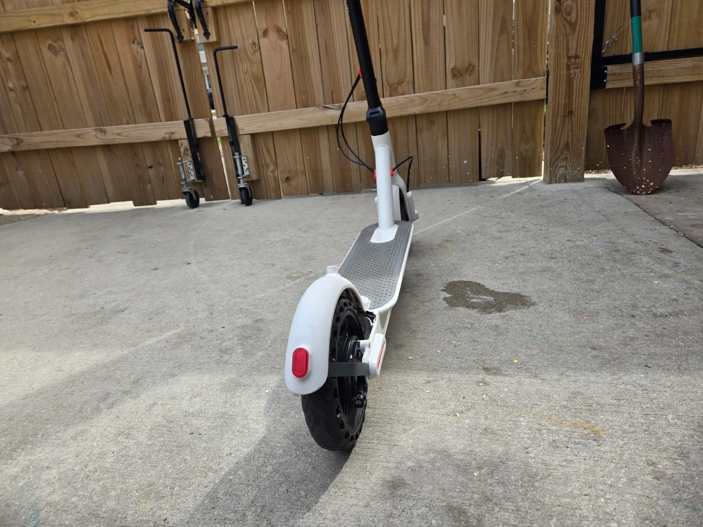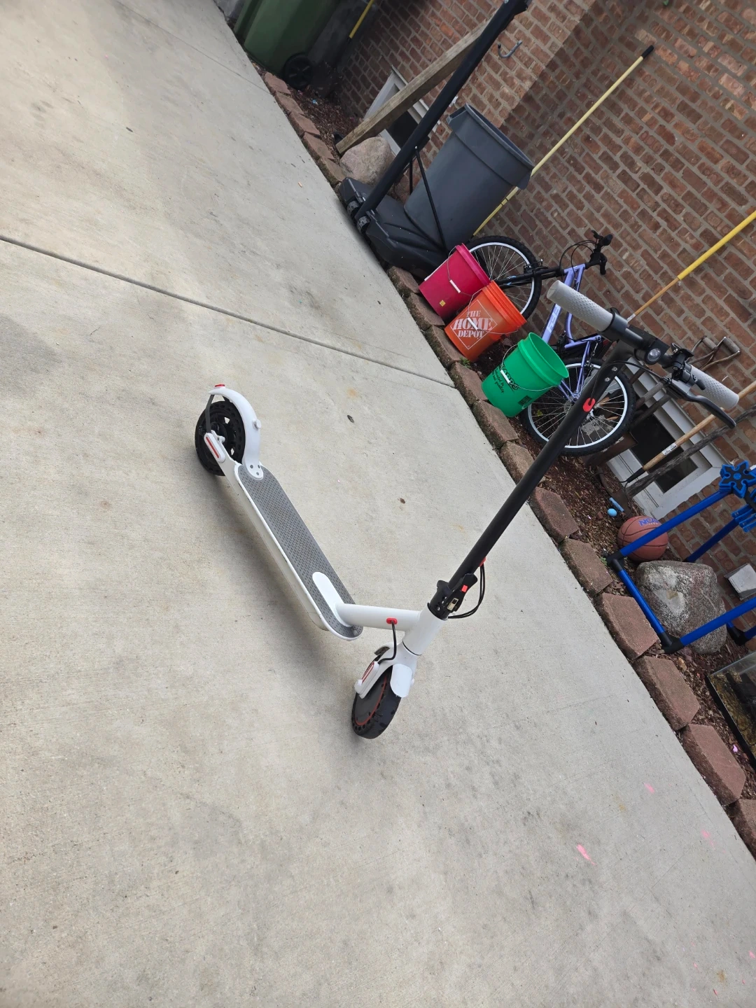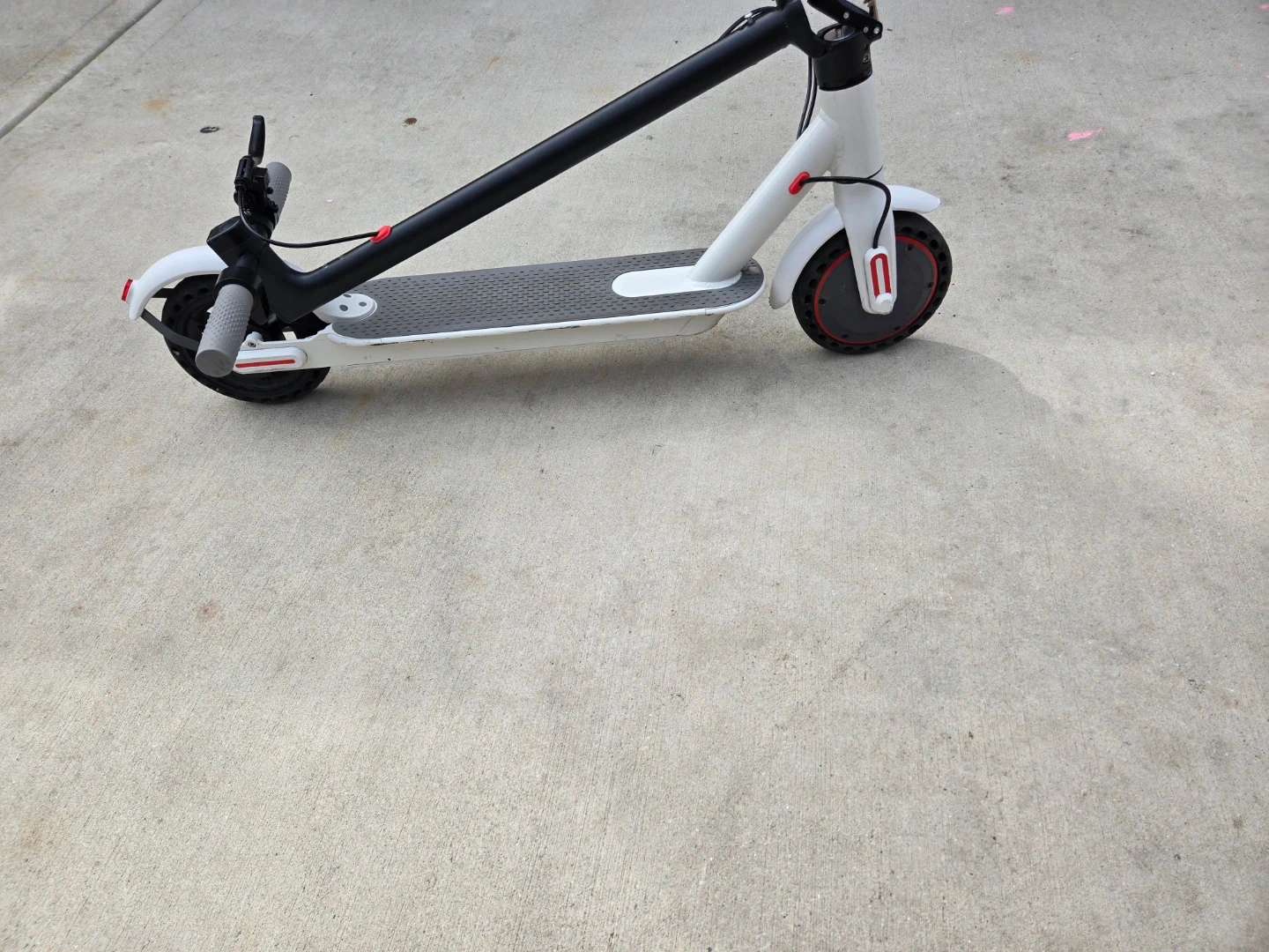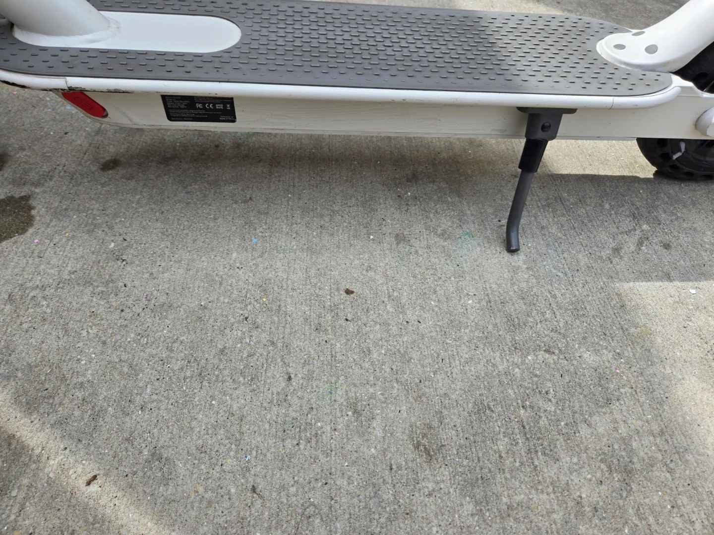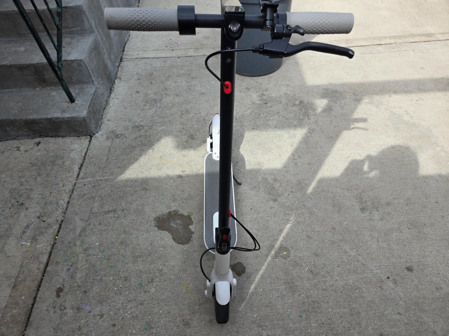 White and gray electric scooter. It has a digital display showing speed and battery life. It's a convenient way to get around! Comes with charger.