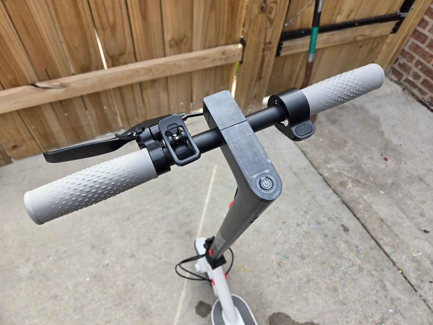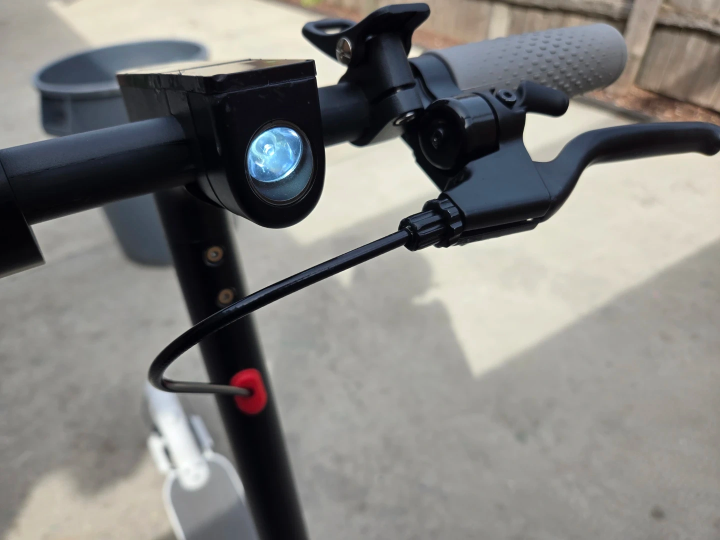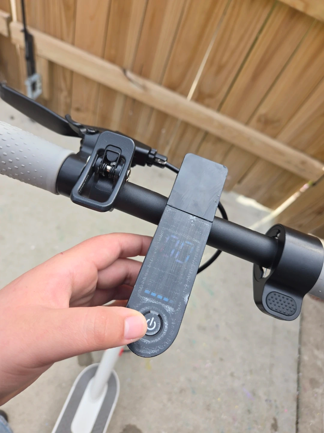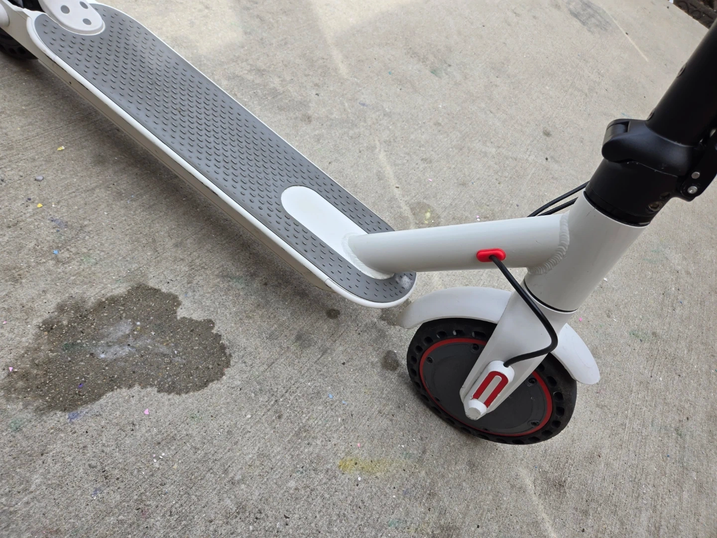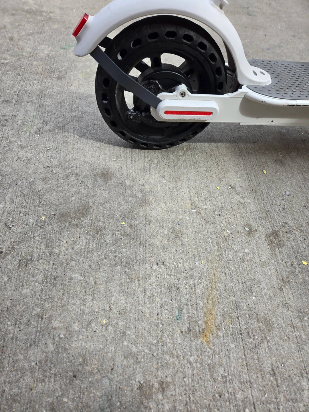 White and gray electric scooter. It has a digital display showing speed and battery life. It's a convenient way to get around! Comes with charger.
