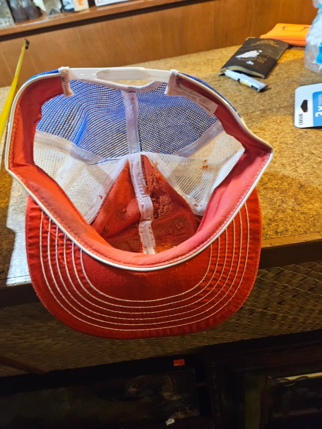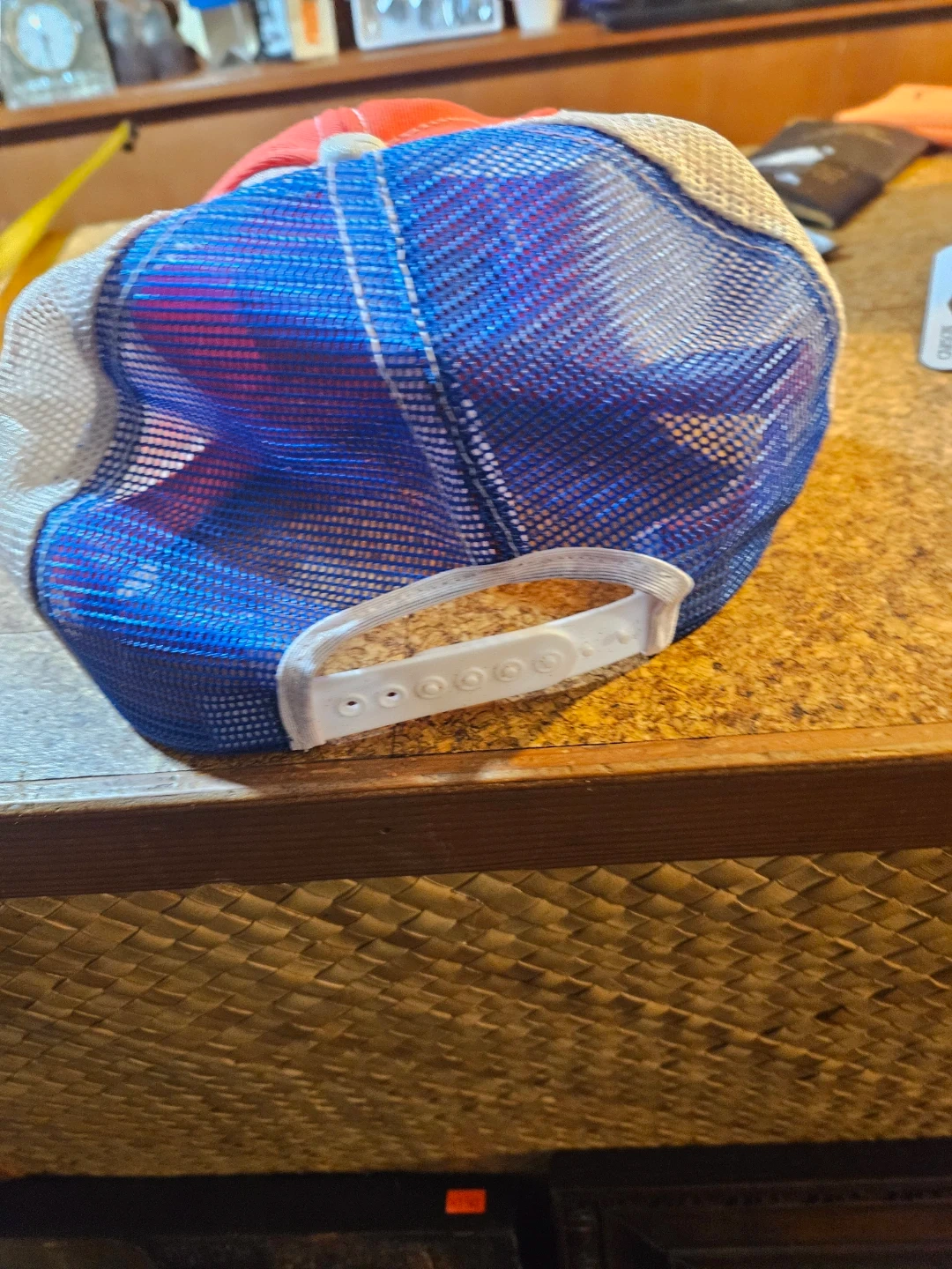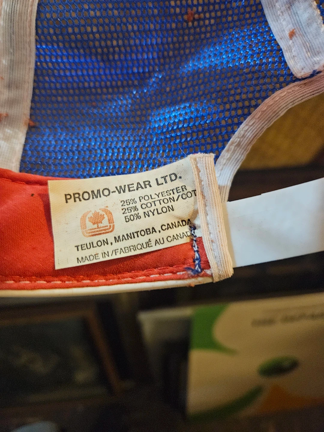 Red, white, and blue trucker hat with 'Bumper to Bumper' embroidery. Made in Canada from 25% polyester, 25% cotton, and 50% nylon. Adjustable snapback closure.