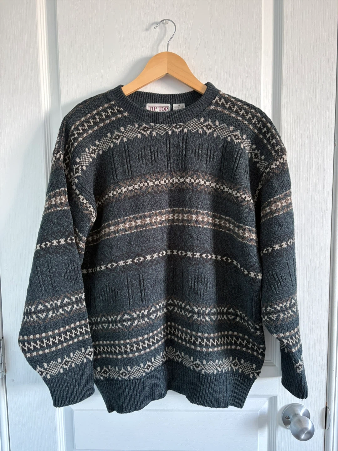 This is a Tip Top men's sweater in size. It's a dark grey knit with a patterned design in white and brown. The sweater has a crew neck and long sleeves.