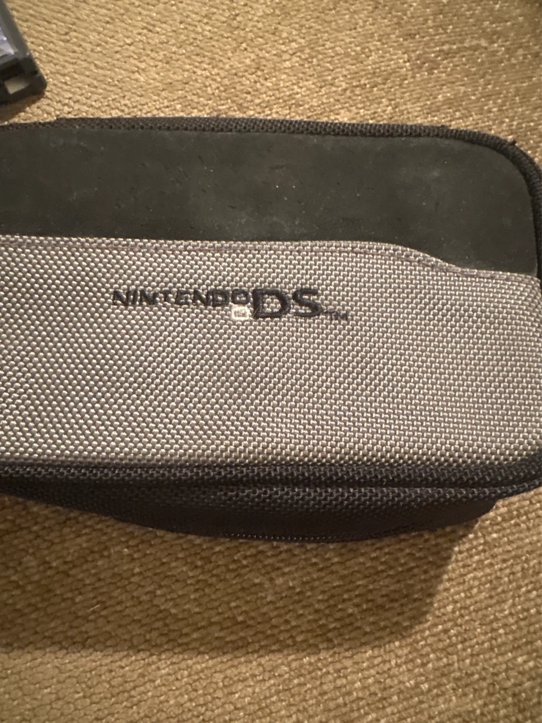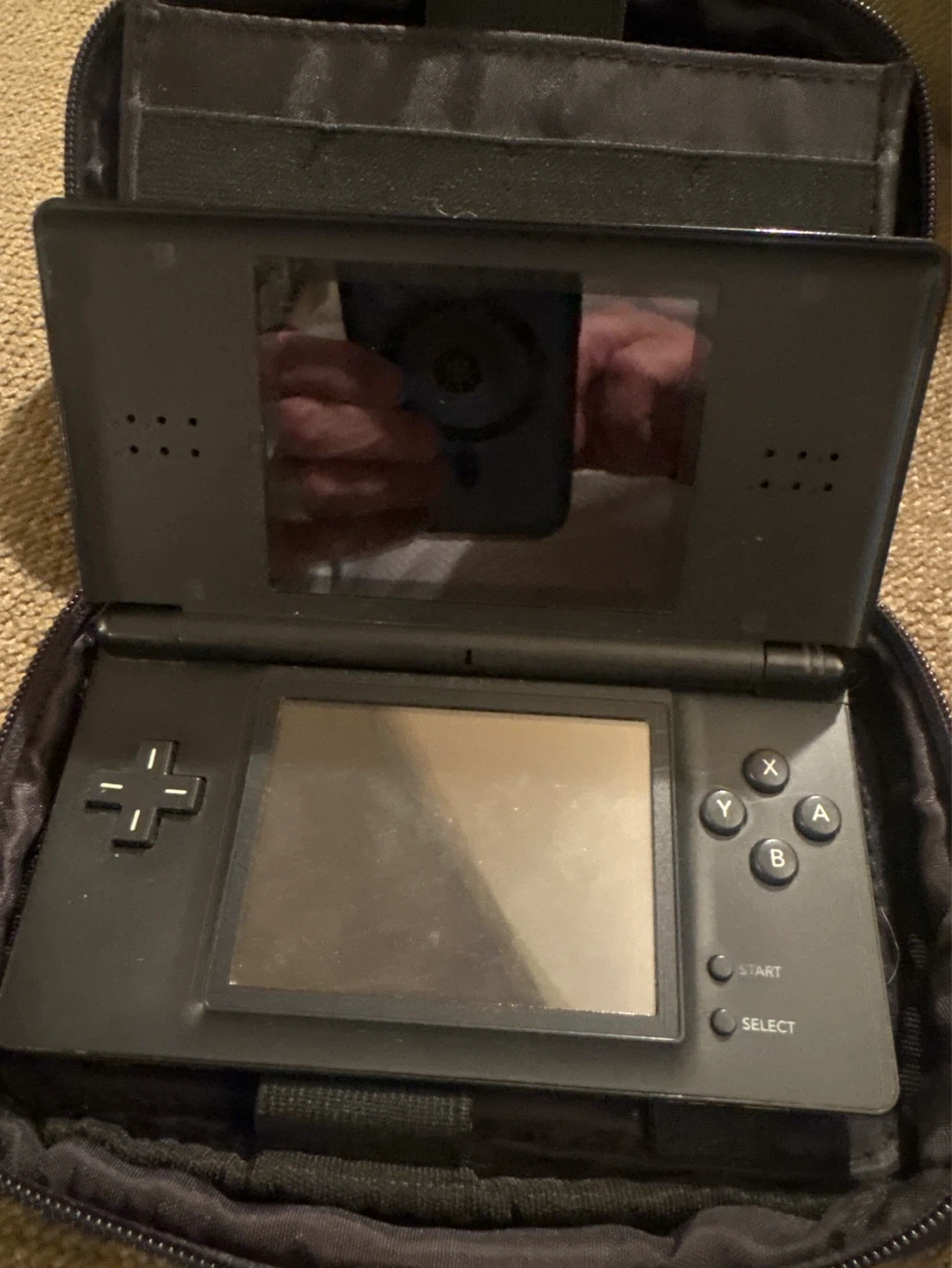 Black Nintendo DS Lite console. It comes with a black protective carrying case. Great for gaming on the go! No cable