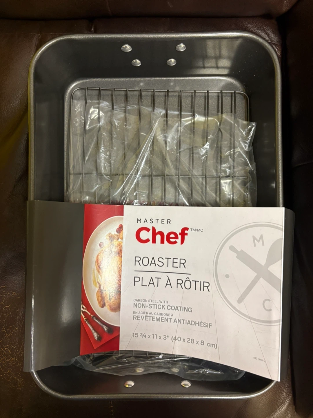 I'm selling a brand new Master Chef roaster still in its original packaging! It's made of carbon steel with a non-stick coating, perfect for roasting. The dimensions are 15 3/4 x 11 x 3 inches (40 x 28 x 8 cm)