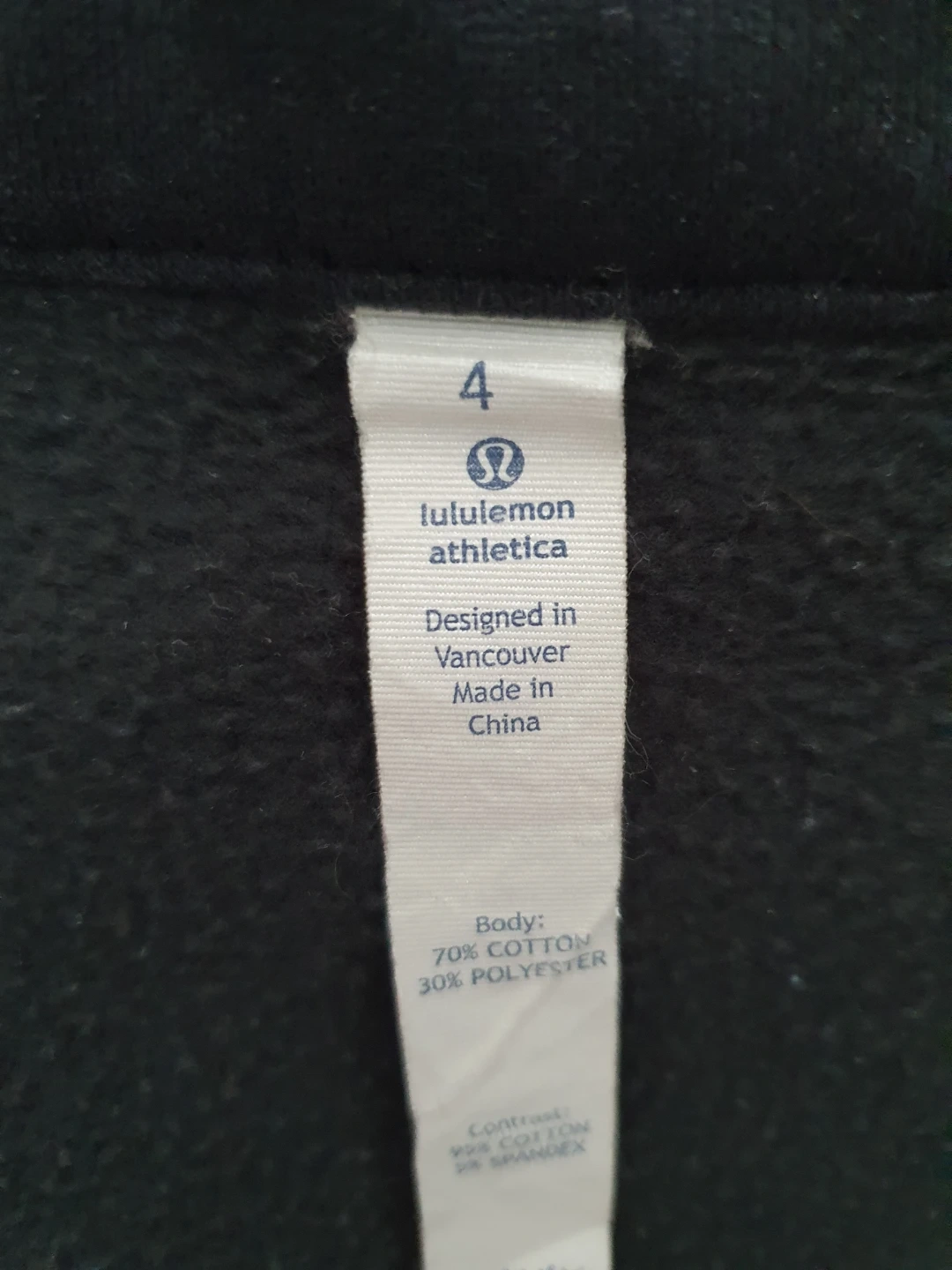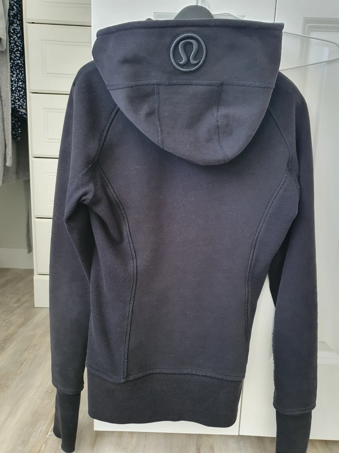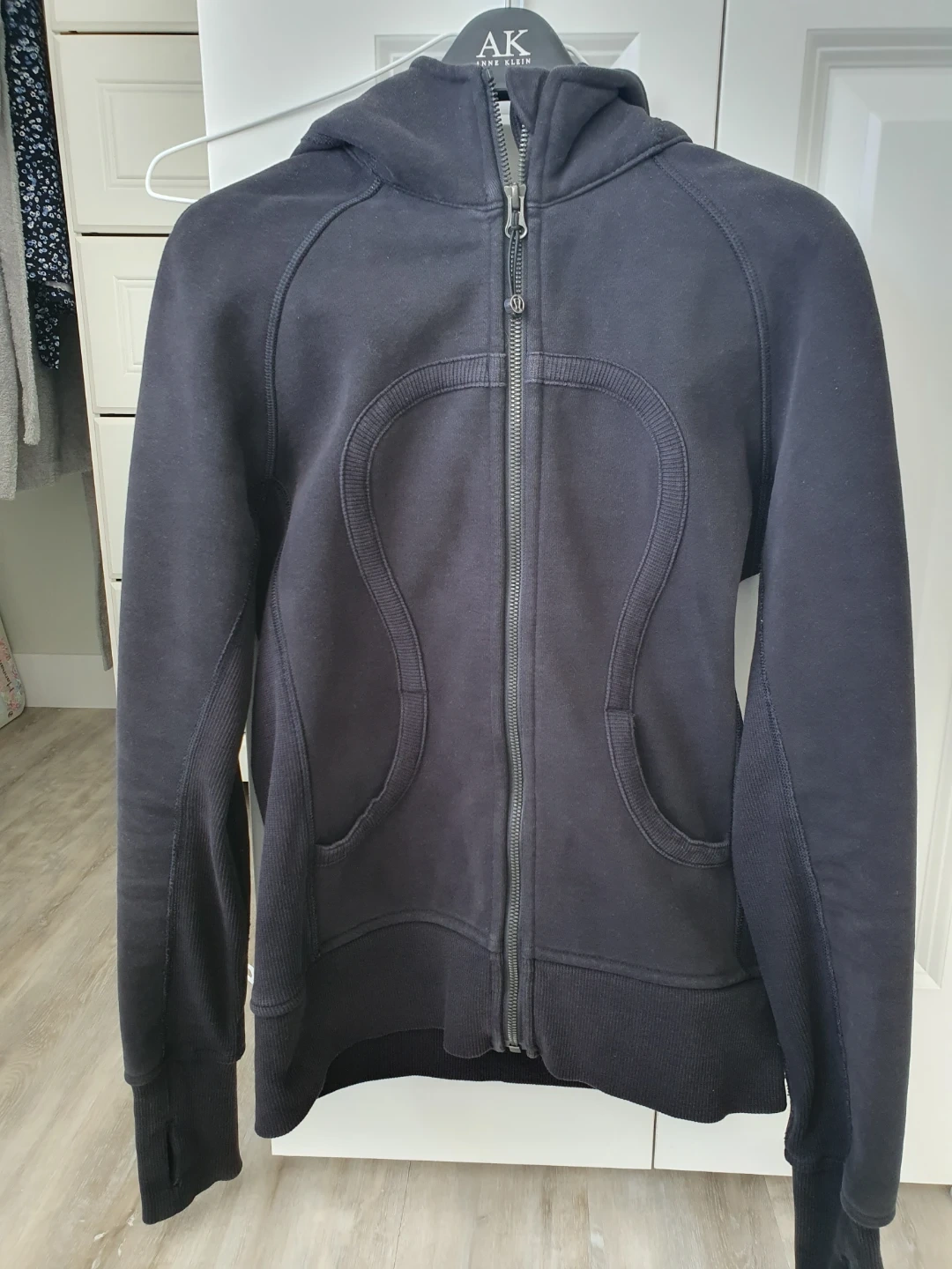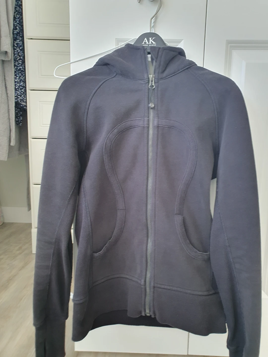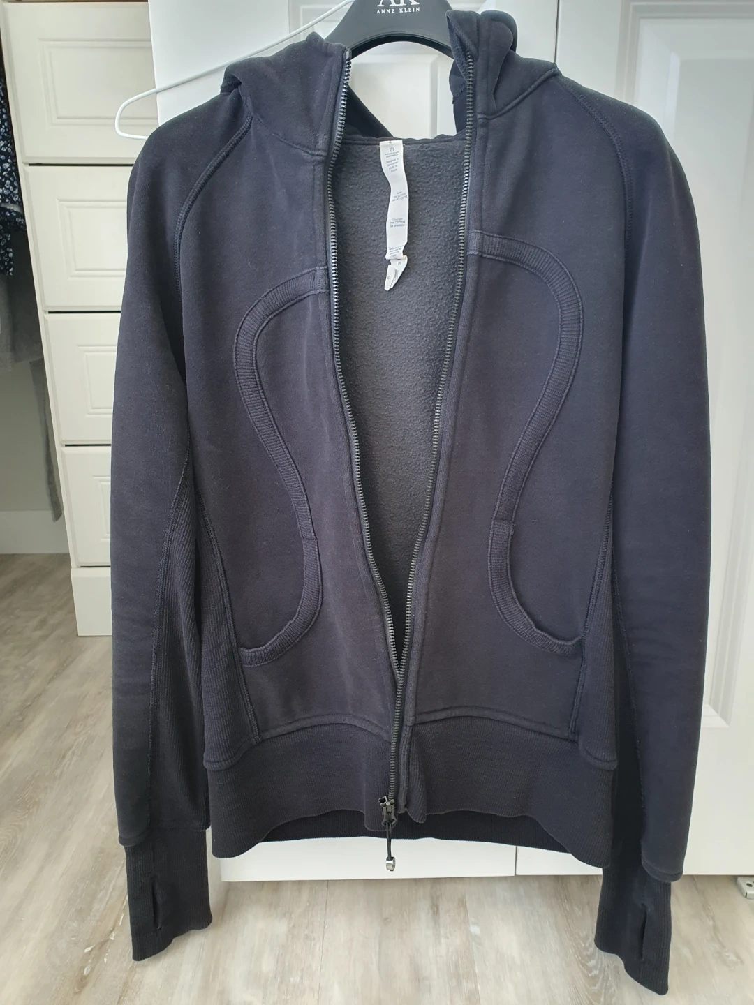 Black Lululemon Athletica hooded zip-up scuba. Features thumbholes on the sleeves and two front pockets. Made from a soft cotton blend material.