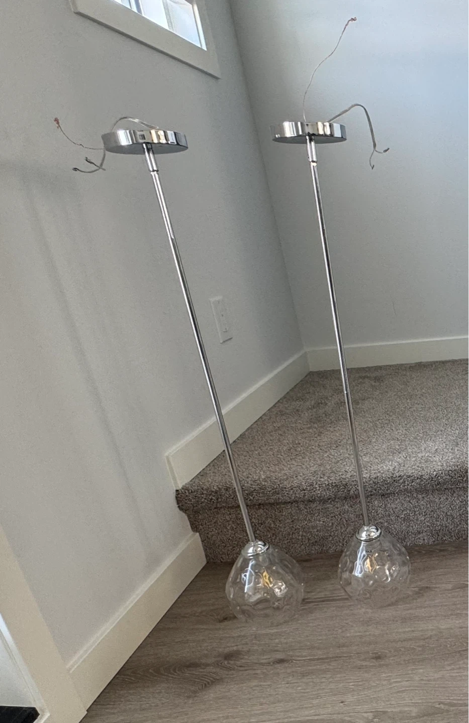 Two pendant light fixtures for sale. Stem measures 29” long and comes in sections so can adjust to the required length.