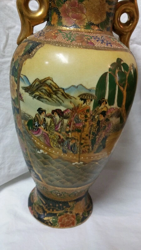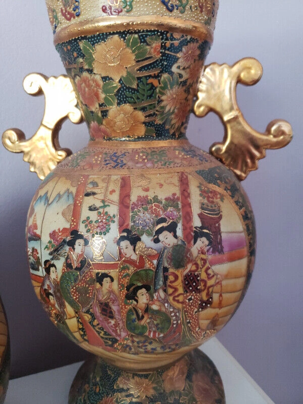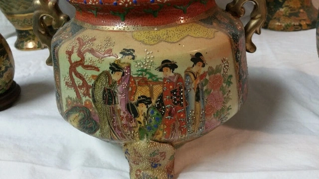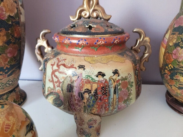 Rare 7 piece Chinese set of SATSUMA. Sign (photo). All 7 pieces are hand painted with exquisite gold gilt. Satsuma Oriental Geisha girl exquisitely formed piece with an abundance of gold gilt work with hand laid pieces forming fabulous hand painted scenes on both sides of all 5 pieces. All pieces are filled with amazing art work and marked on the bottom.
