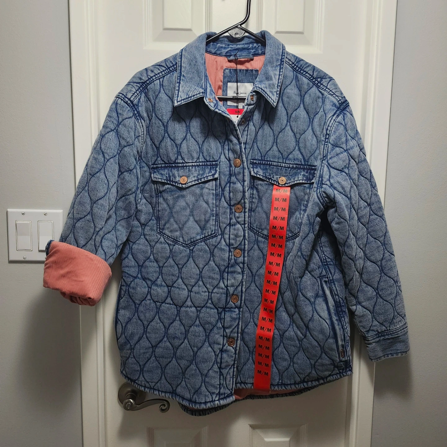 PEPE JEANS of LONDON Heavy Quilted Denim Jacket with thick lining perfect for spring, cool summer nights, & fall. Generously sized, snap buttons, longer in back, faded denim.