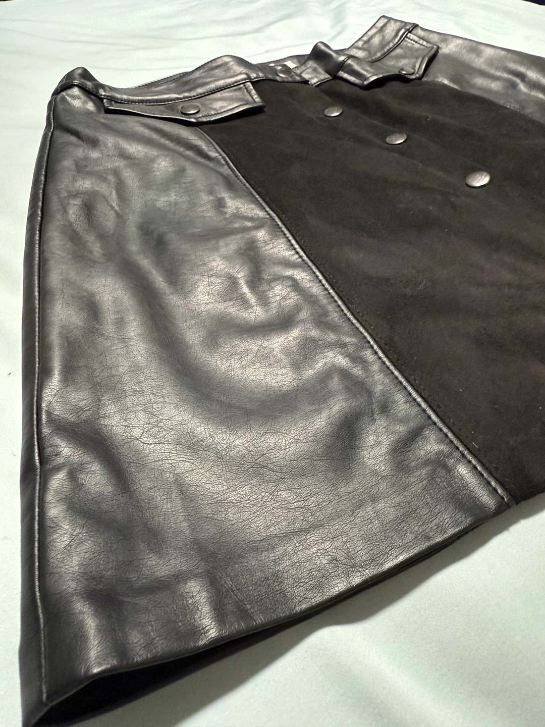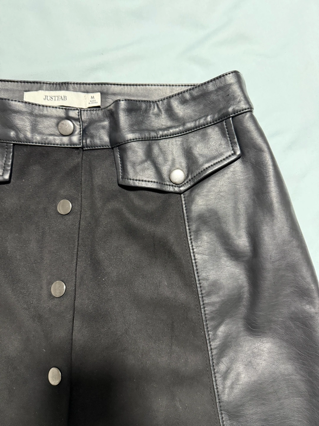 Comfortable lightweight skirt featuring a snap-button front, faux leather paneling, and faux suede center. Western-inspired flap pocket details at the waist. Worn maybe once or twice. Size M