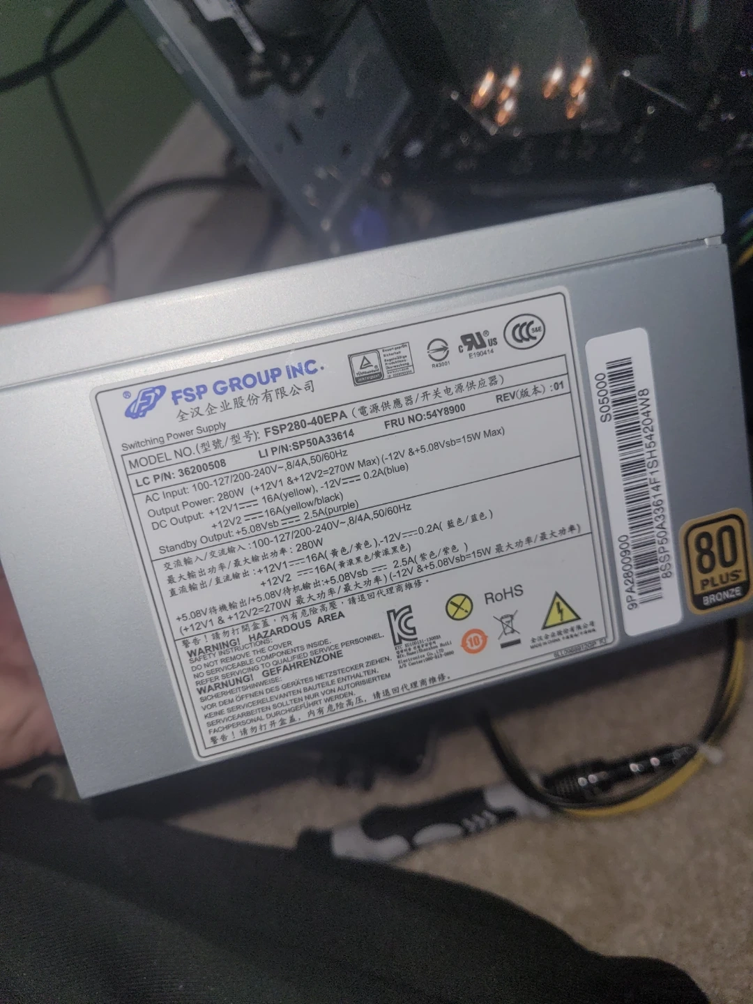 Selling a used FSP Group Inc. FSP280-40EPA power supply. It supports AC Input of 100-127/200-240V~, 8/4A, 50/60Hz and has an output power of 280W.