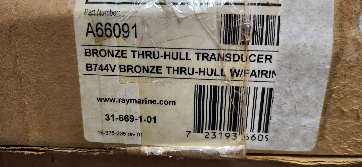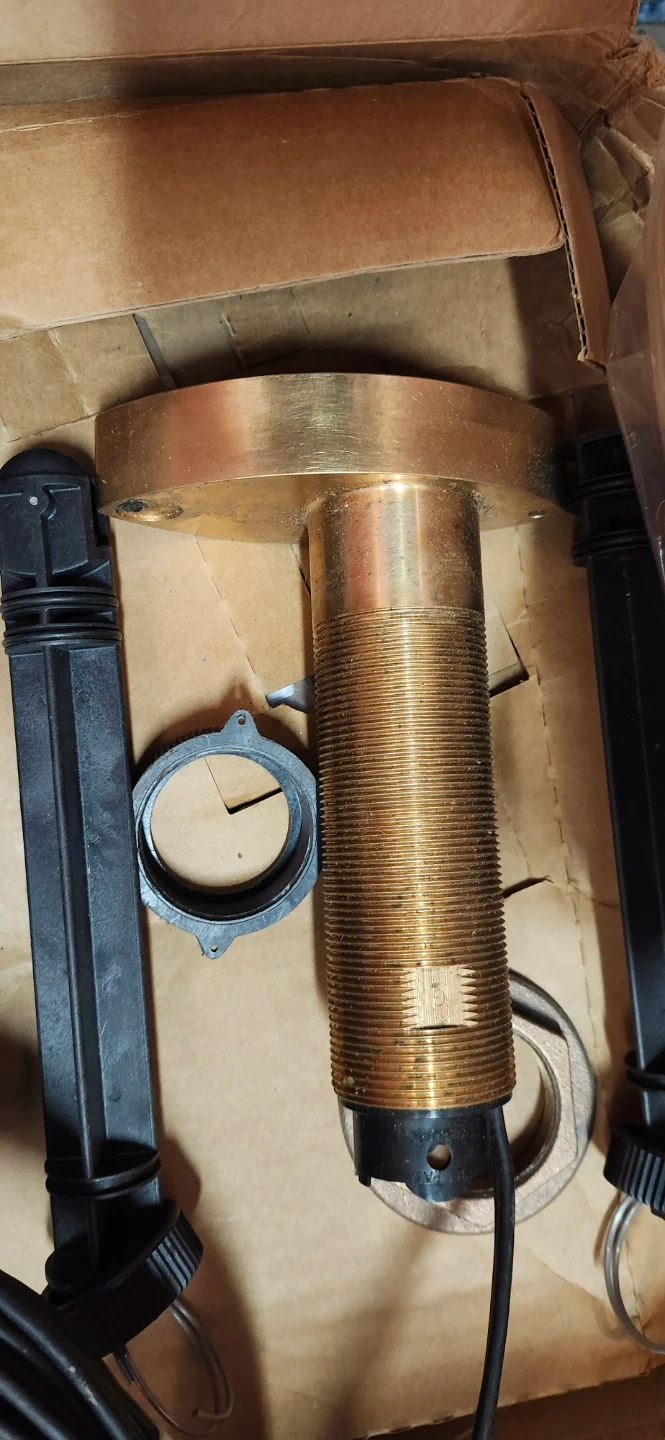 This is a new 877-541-2255 Airmar, Raymarine depth sounder transducer. It's made of bronze and includes a blue fairing block. This transducer is used where the hull thickness requires a long insert length