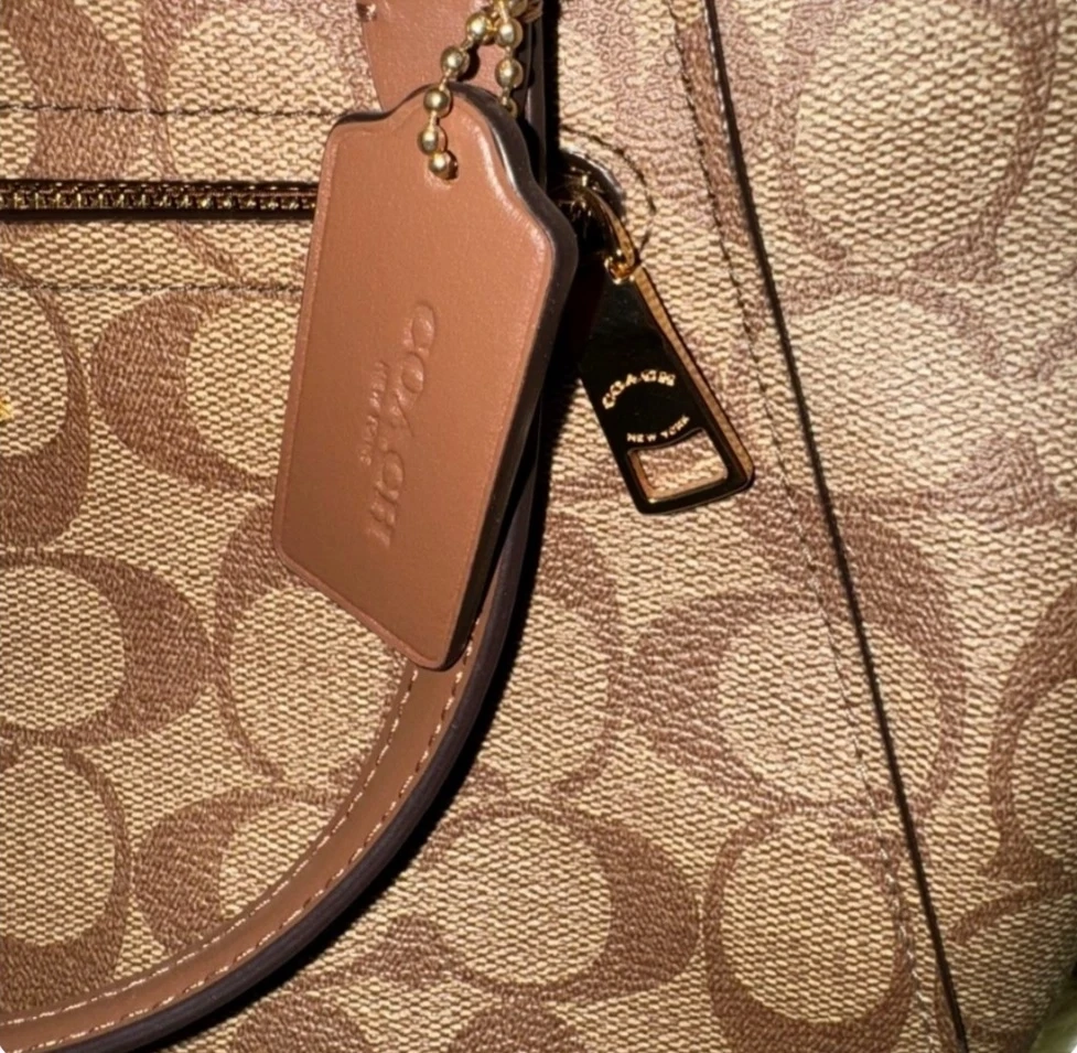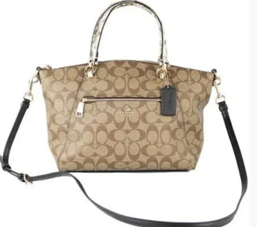 A classic Coach satchel handbag featuring the signature monogram pattern. It's made with durable coated canvas and leather trim. This bag comes with both top handles and a detachable shoulder strap for versatile carrying. It has an interior zip pocket and a secure top zip closure.