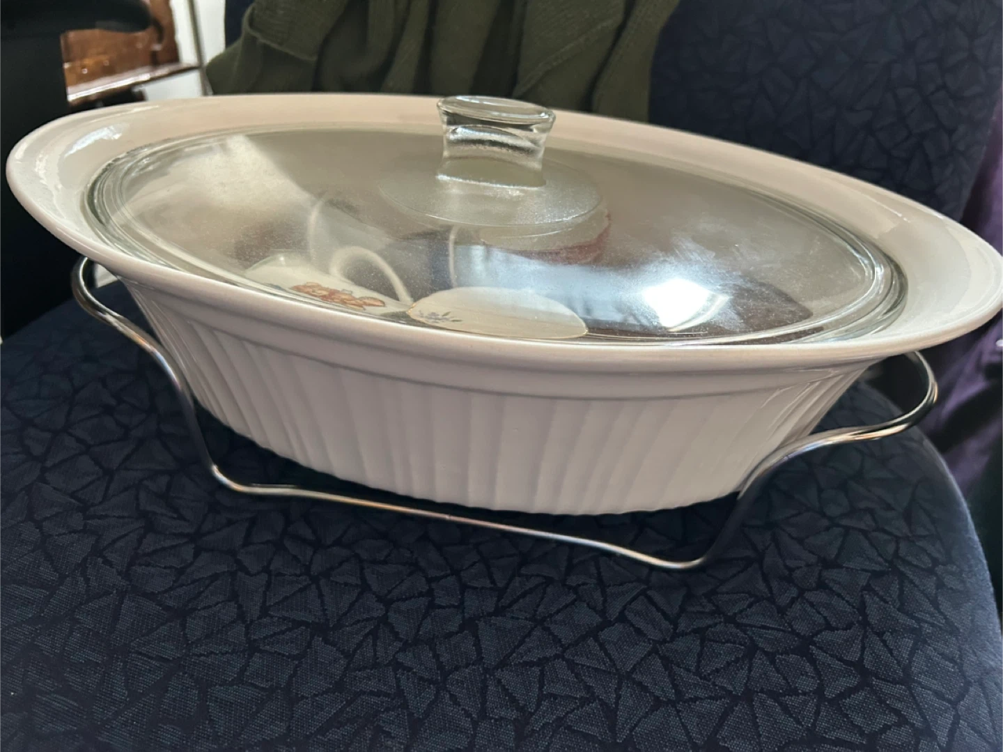 Selling a lovely oval casserole dish complete with a glass lid and a metal stand! It's perfect for baking and serving your favourite dishes. The dish is white with a ribbed design, and the stand adds a touch of elegance to your table. It's in great condition and ready for a new home chef