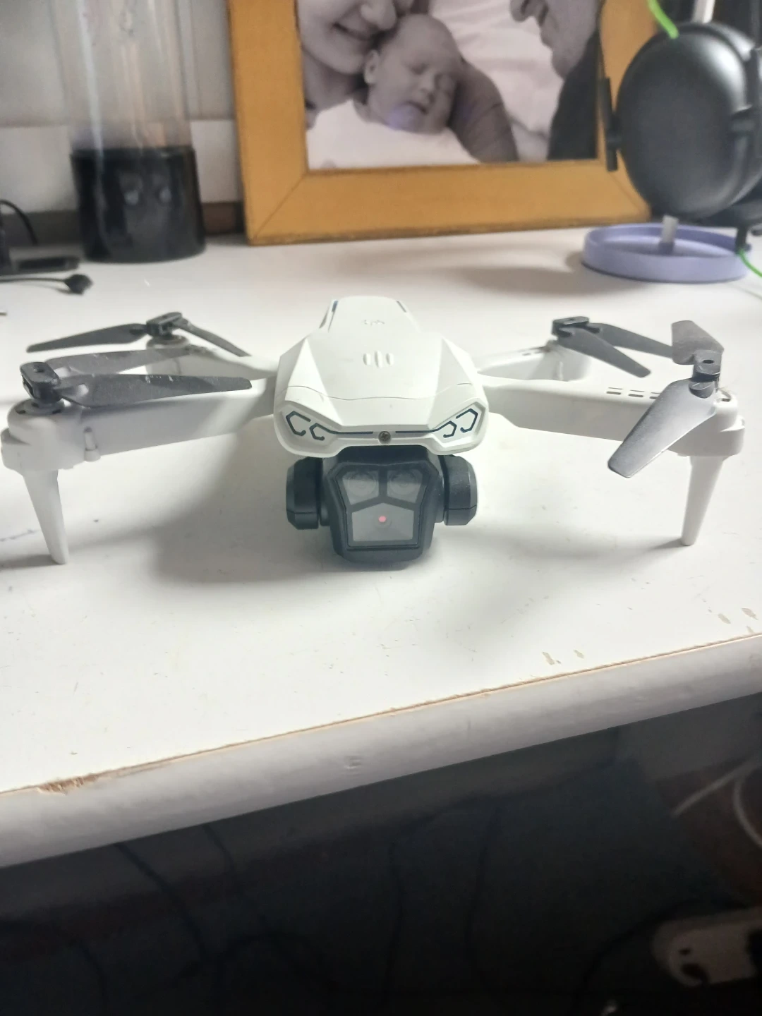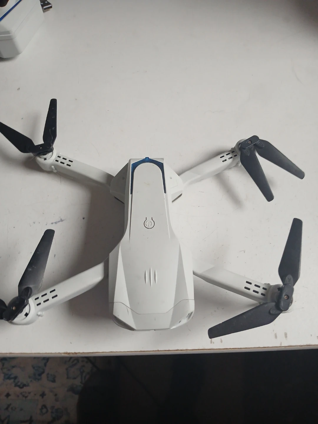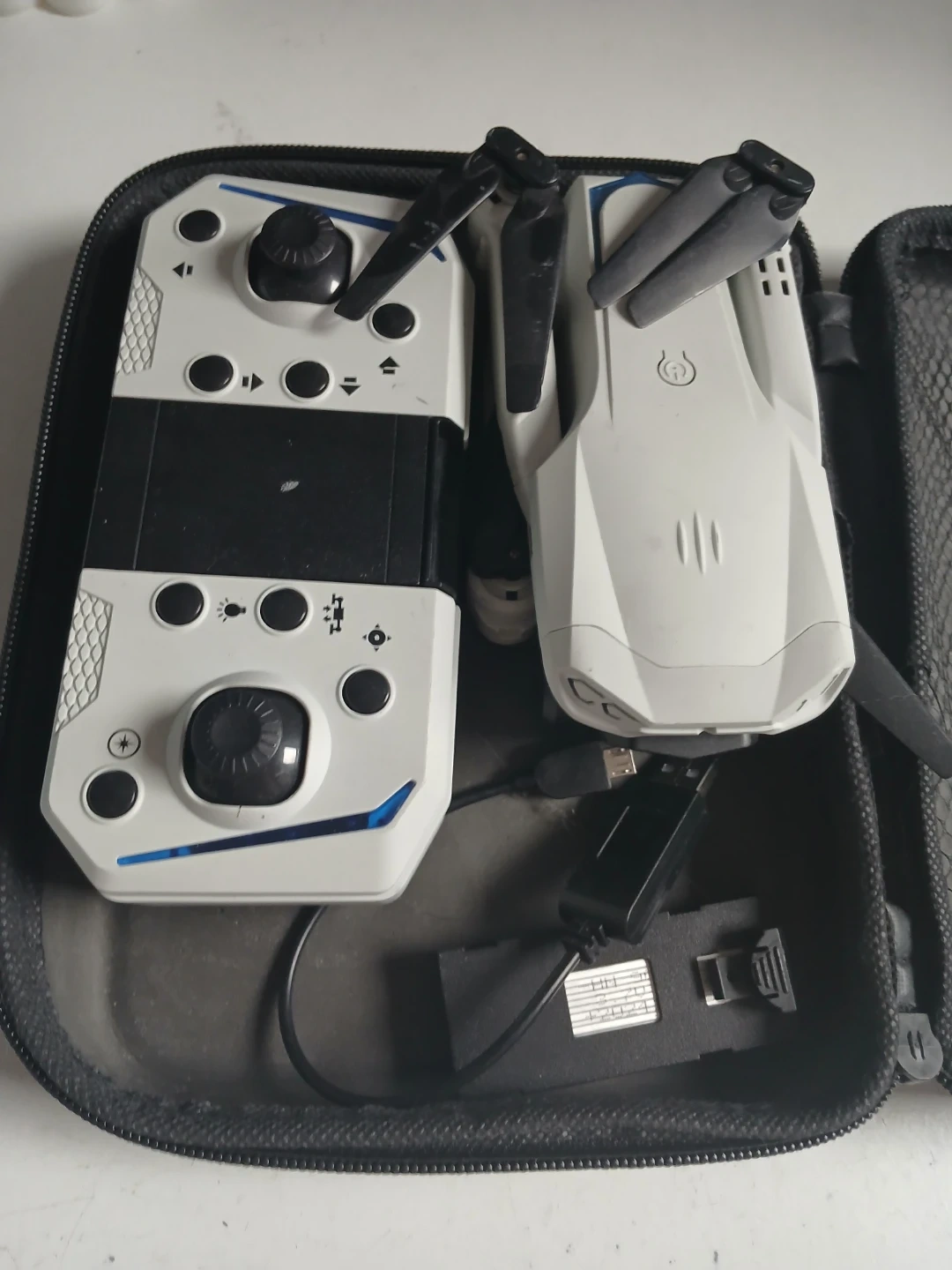 This white foldable drone comes with a remote control and charging cable. It's compact and easy to transport in its included case. Perfect for beginners wanting to learn drone flying!