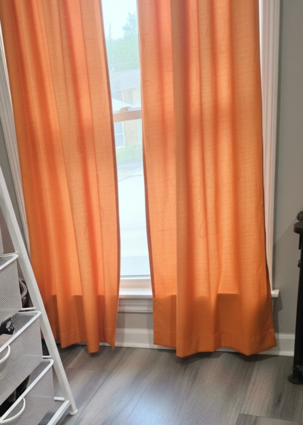 Selling a variety of curtains in different colours! There's a sage green set, a bright orange set, and a shimmery gold set. Great for adding a pop of colour or a touch of elegance to any room. 10$ each
