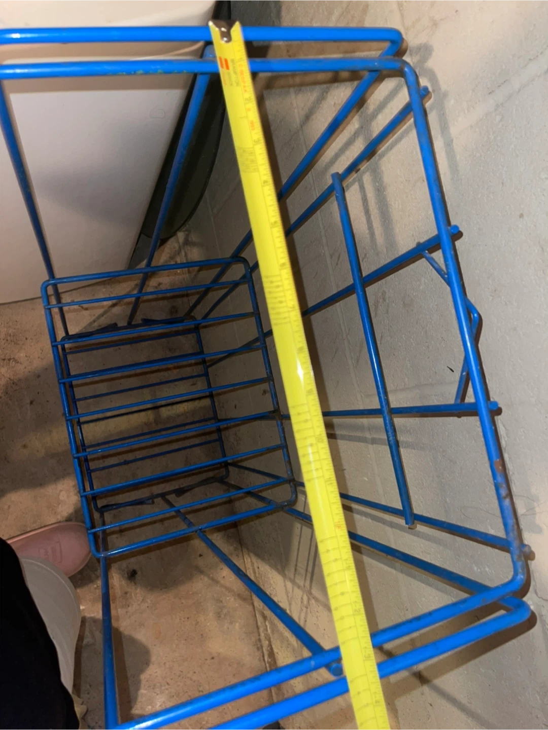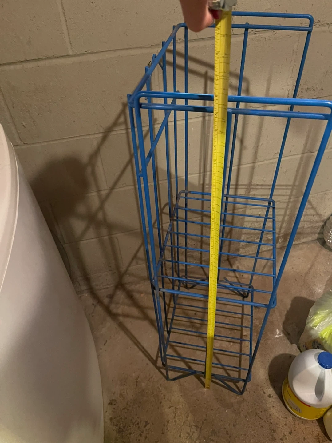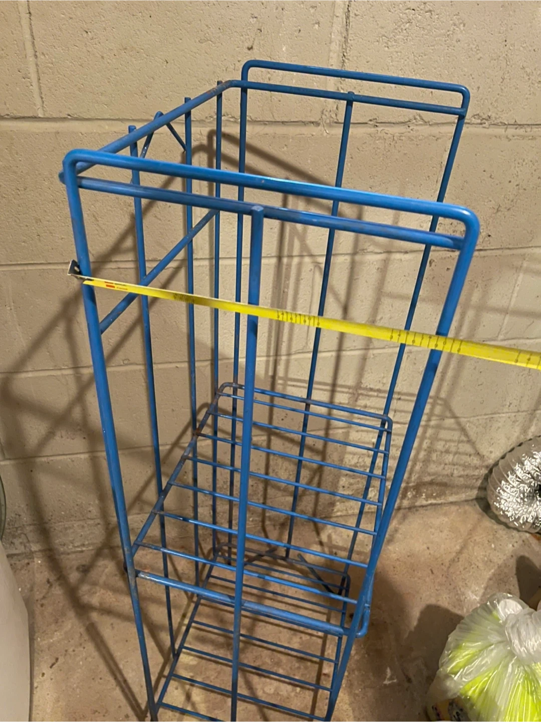 This is a blue wire storage rack with two shelves. It's made of metal wire. The rack is useful for organizing items in a basement or laundry room.