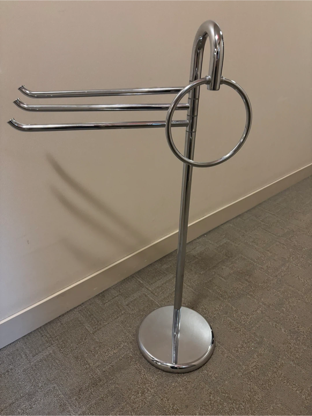 India Corella style freestanding chrome towel rack - mint condition - features a weighted round base for stability, three adjustable or swivel arms for hanging towels, and a circular towel ring - 3ft/96cm high - cash North Central Toronto, can deliver