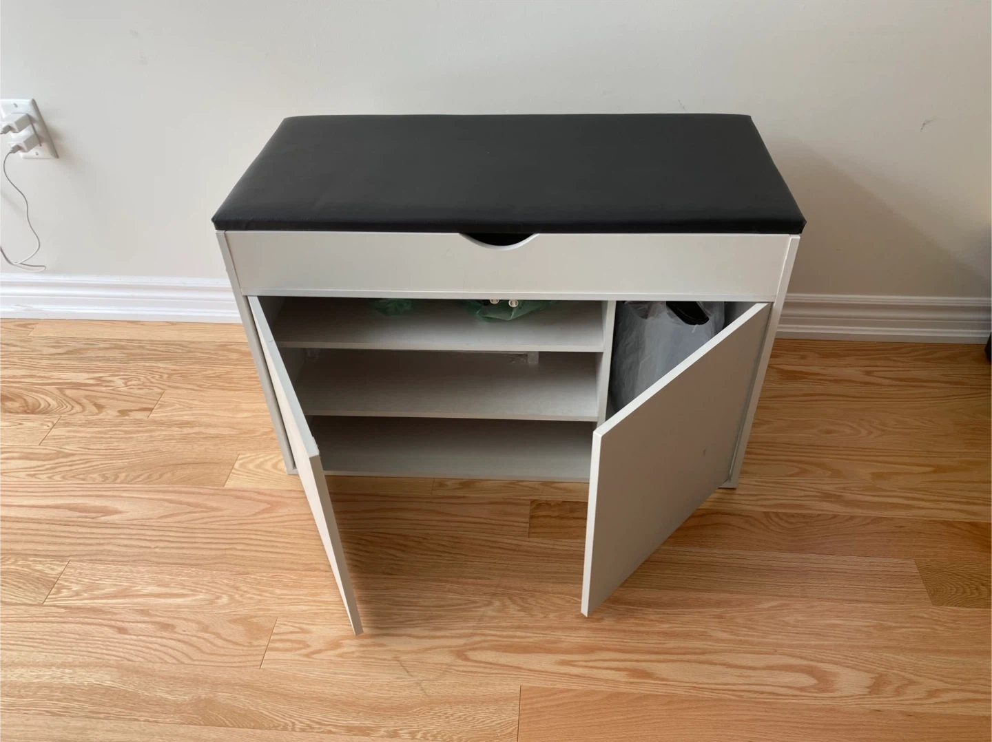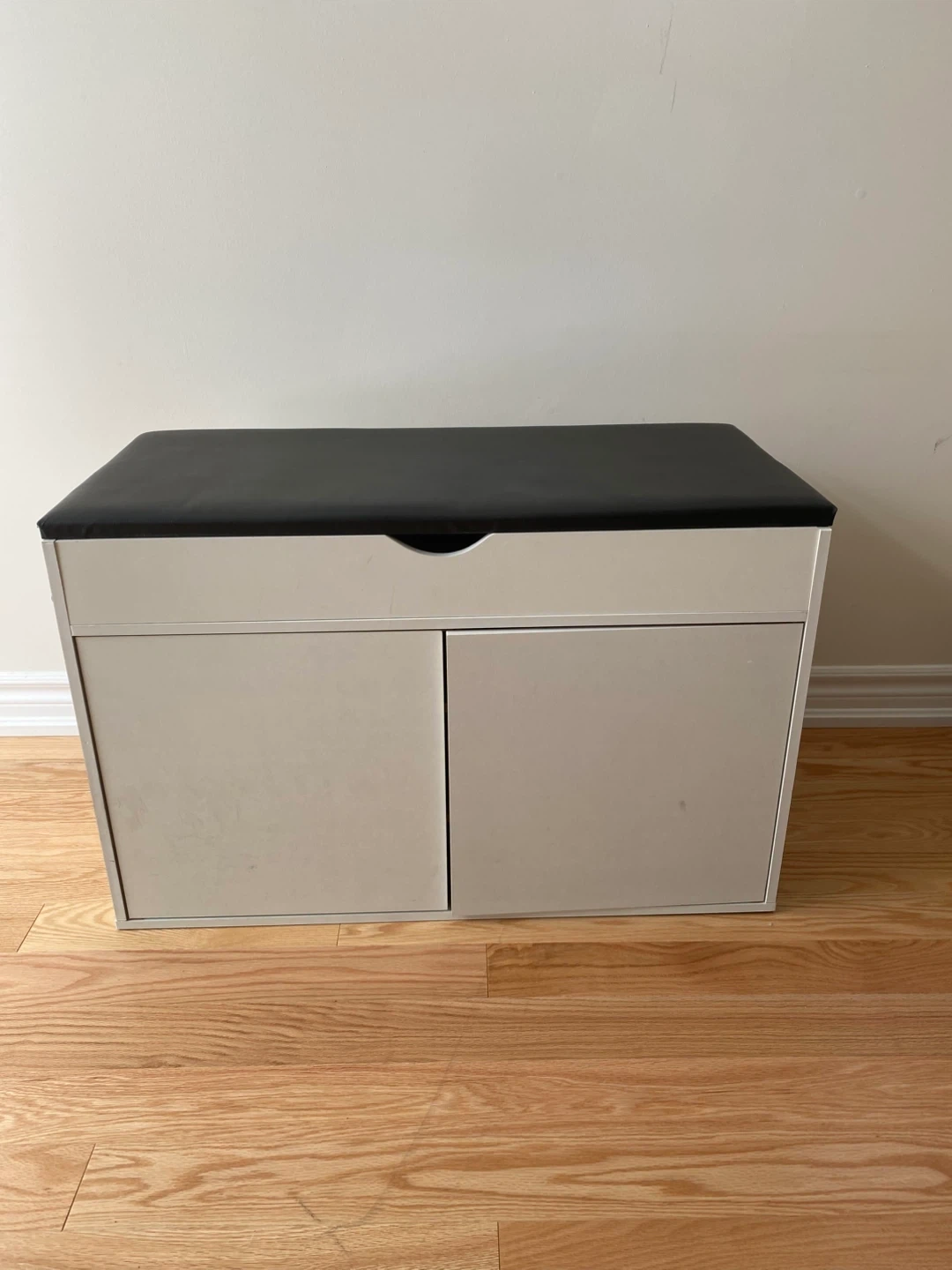 This shoe cabinet offers storage and seating. It has two doors that open to reveal shelves for shoes. The padded top provides a convenient place to sit. It's a great addition to an entryway or mudroom!