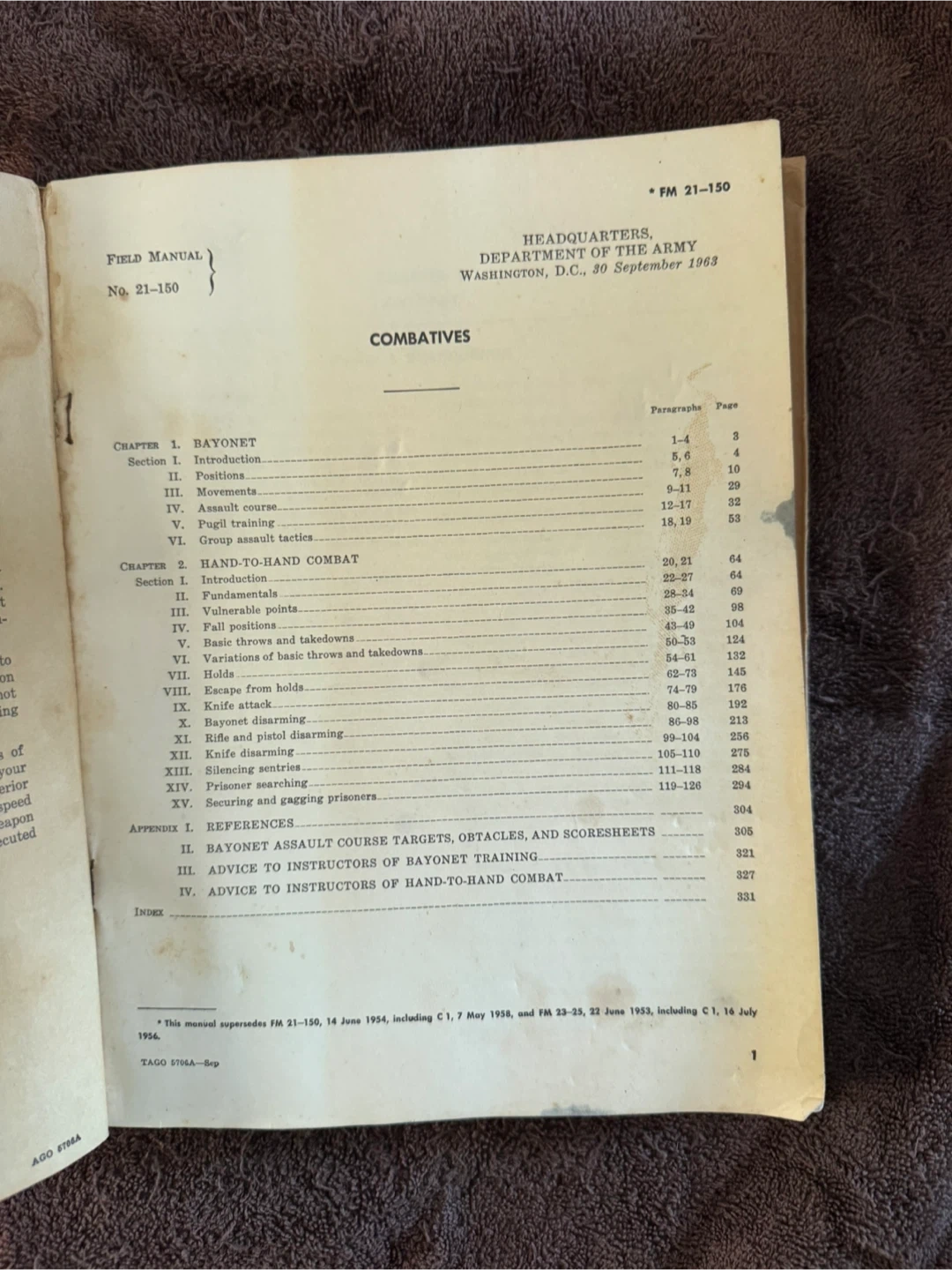 Selling a copy of FM 21-150, a Department of the Army Field Manual focused on Combatives. This manual was published in September 1963 and covers topics such as bayonet assault course targets, obstacles, and scoresheets, as well as advice to instructors of bayonet training and hand-to-hand combat.