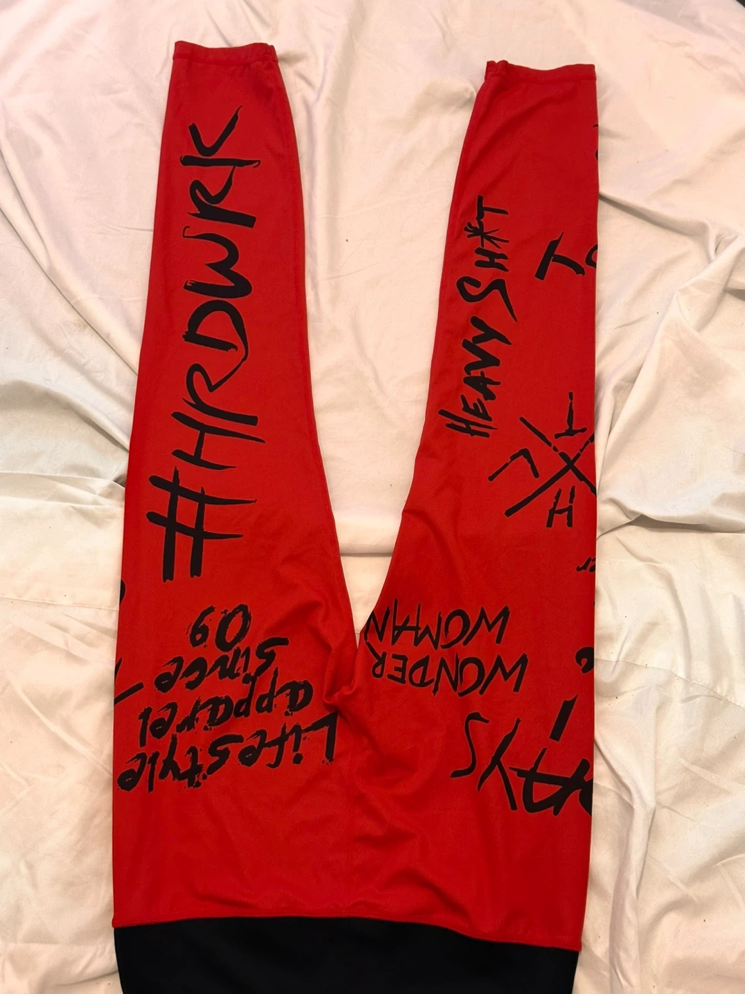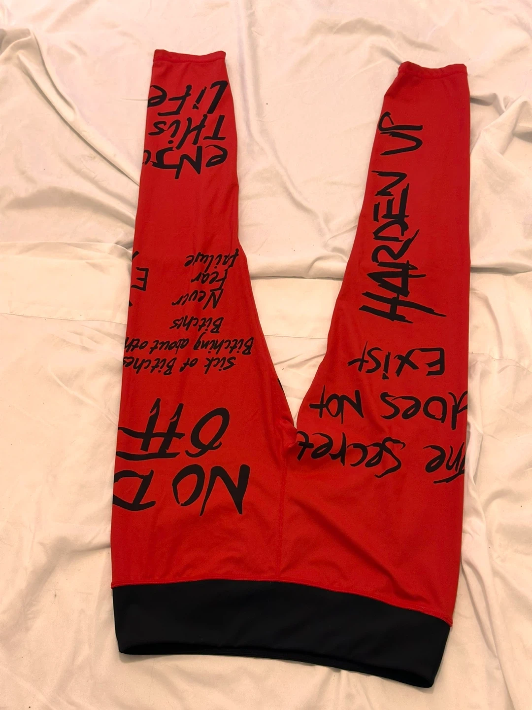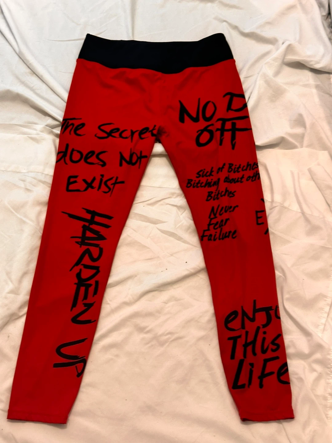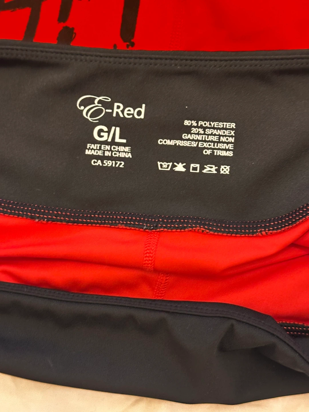 E-Red leggings in size G/L. Made from 80% polyester and 20% spandex. Features bold graphic print and a comfortable waistband. Great for activewear!