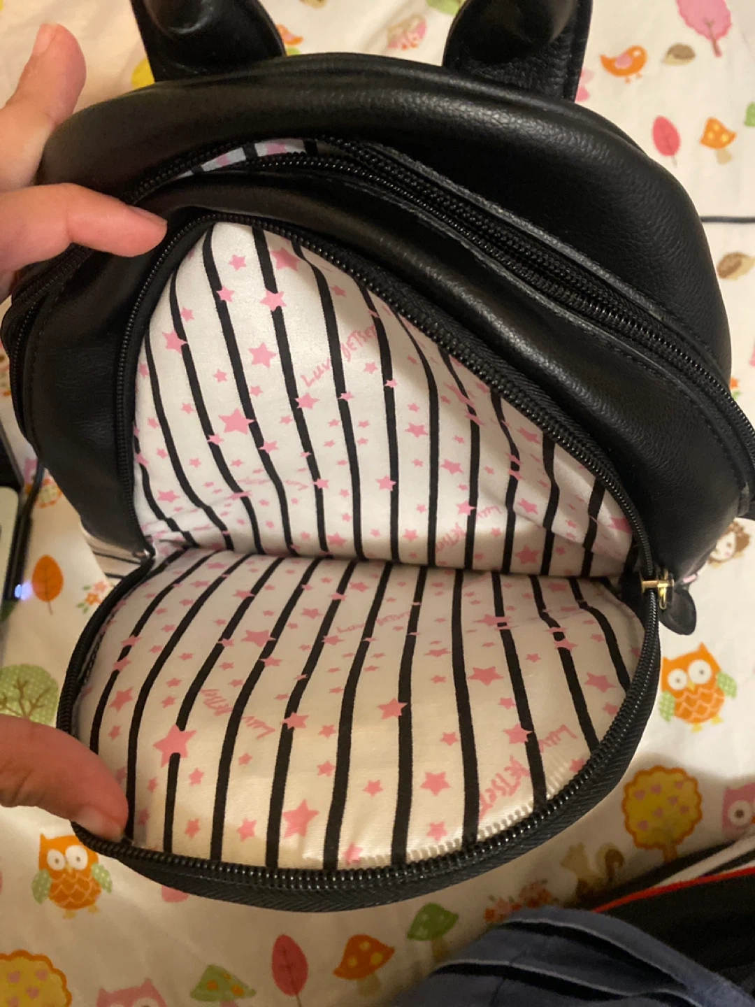 This is a cute Betsey Johnson black small backpack. It has a striped interior with pink stars and a small zipper pocket. The exterior has a dog print on the front and straps with the brand name on the back.