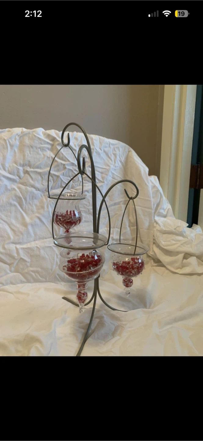 Partylite hanging ice crystals tea light holder with red and clear beads. This glass tree features three hanging glass bowls, perfect for displaying decorative stones, or other small items. It adds a touch of elegance and whimsy to any room, and it's sure to be a conversation starter