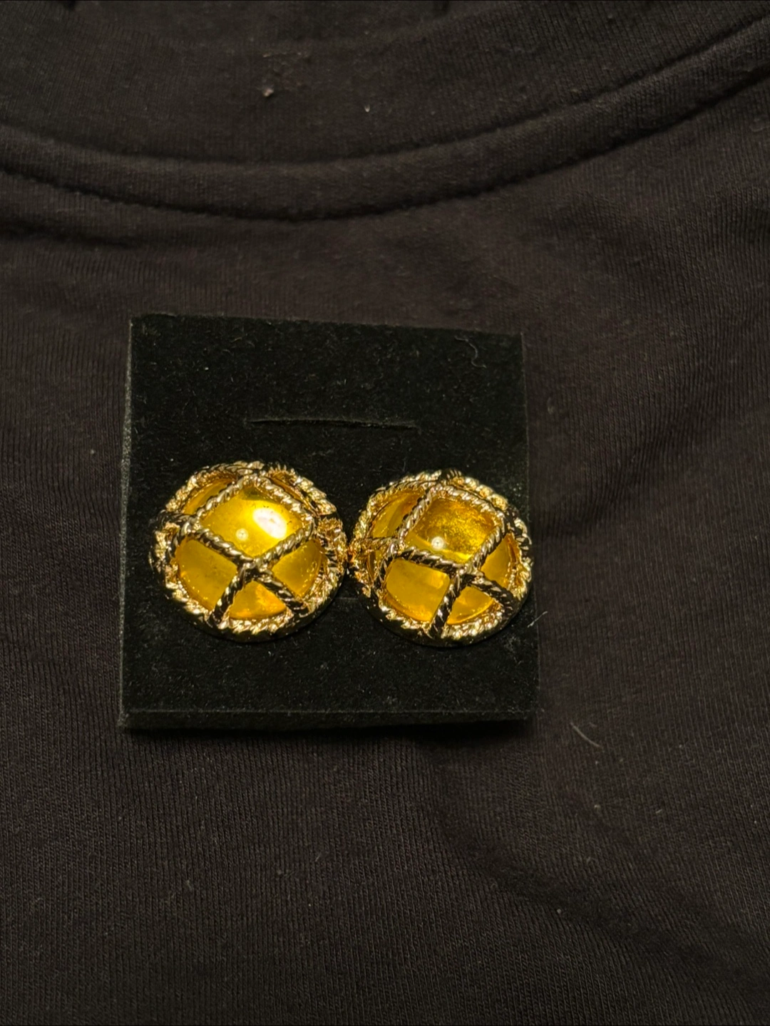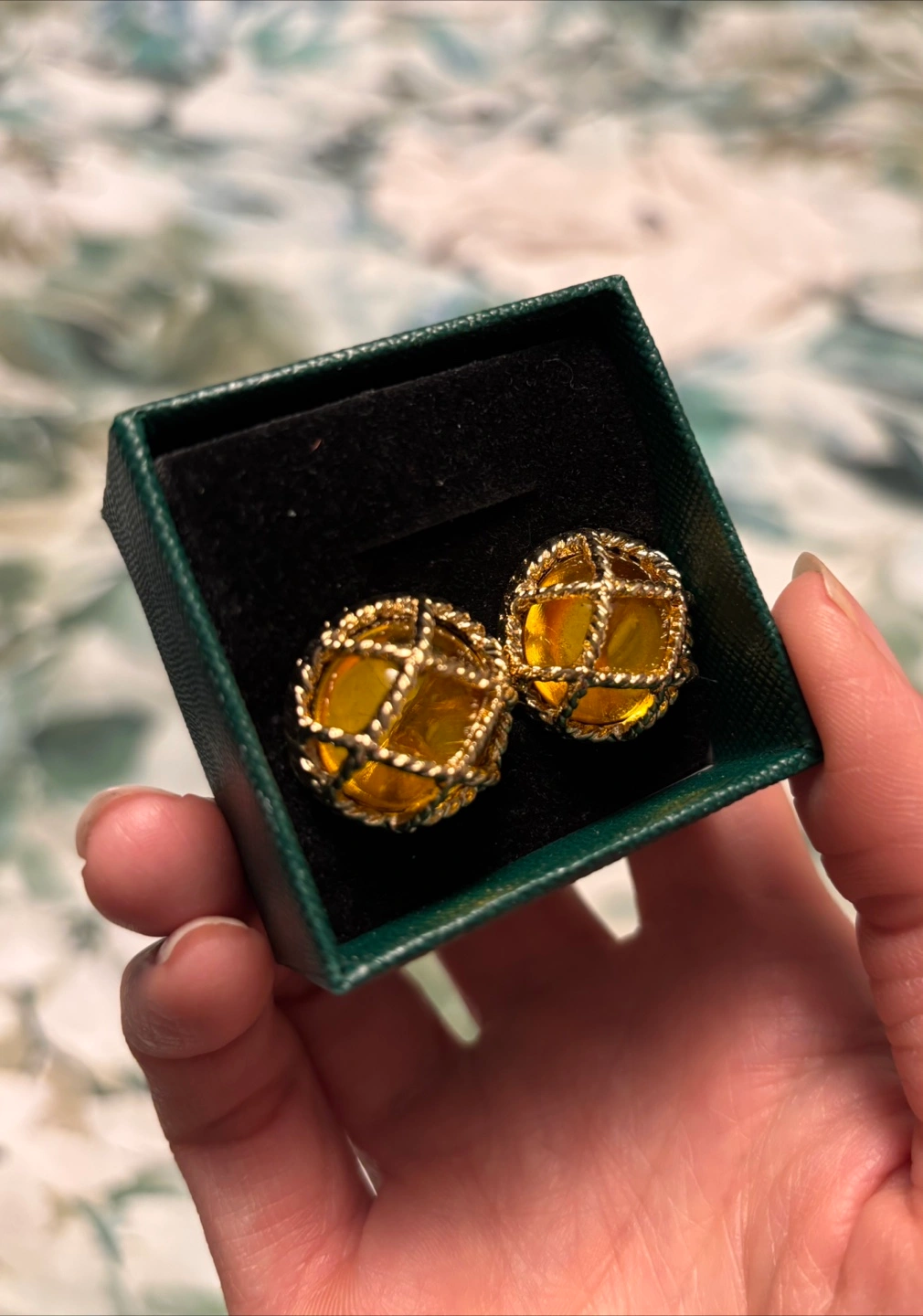 These earrings feature a beautiful gold-toned design, with a unique cage-like pattern. The earrings are contained in a green box with a black velvet interior. Perfect for adding a touch of elegance to any outfit.