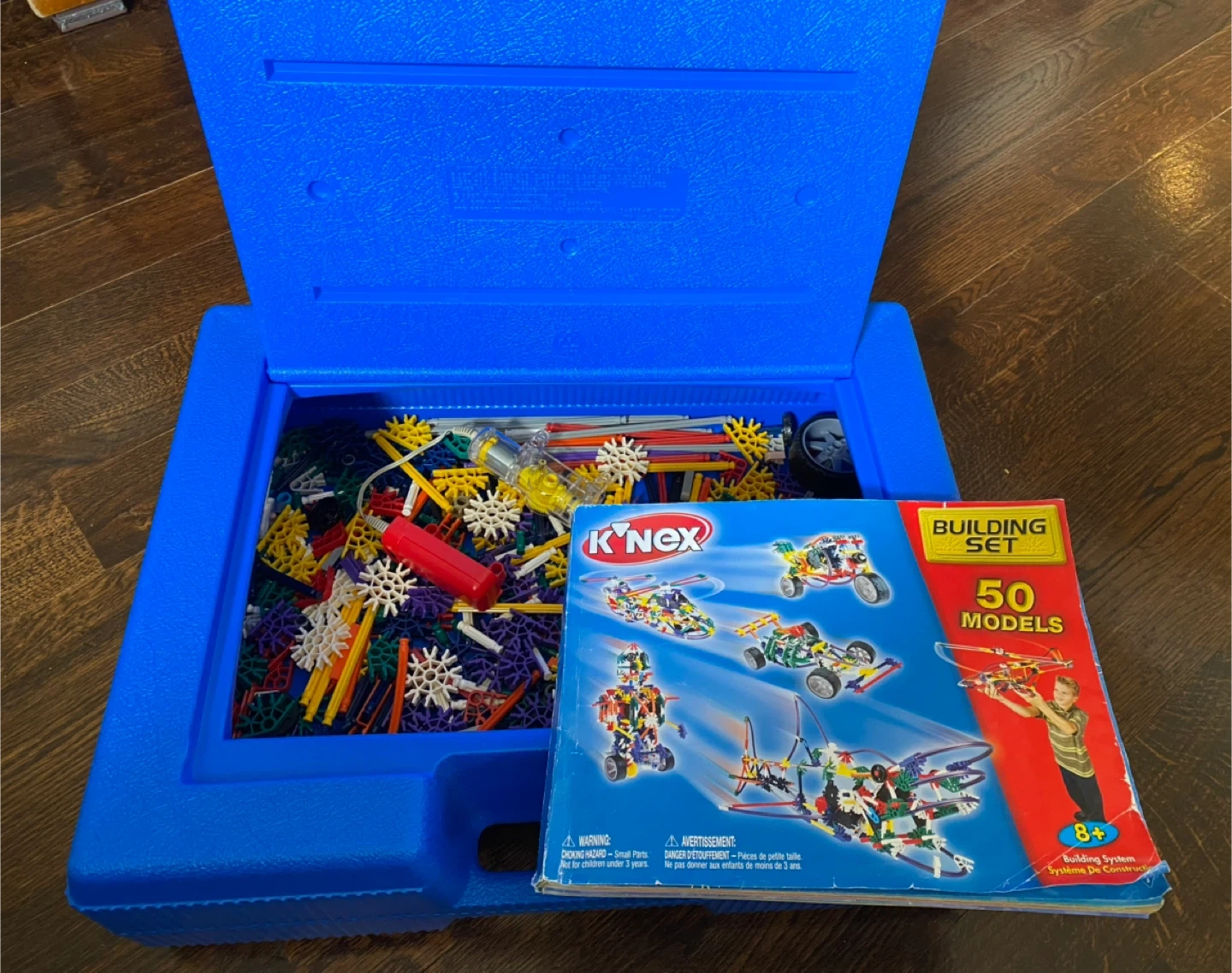 This K'NEX 50 model building set comes with many colourful pieces a battery-powered electric motor, manual and carry case. Manual is a bit worn but all there. The box indicates it's suitable for ages 8 and up and allows for building 50 different models.
