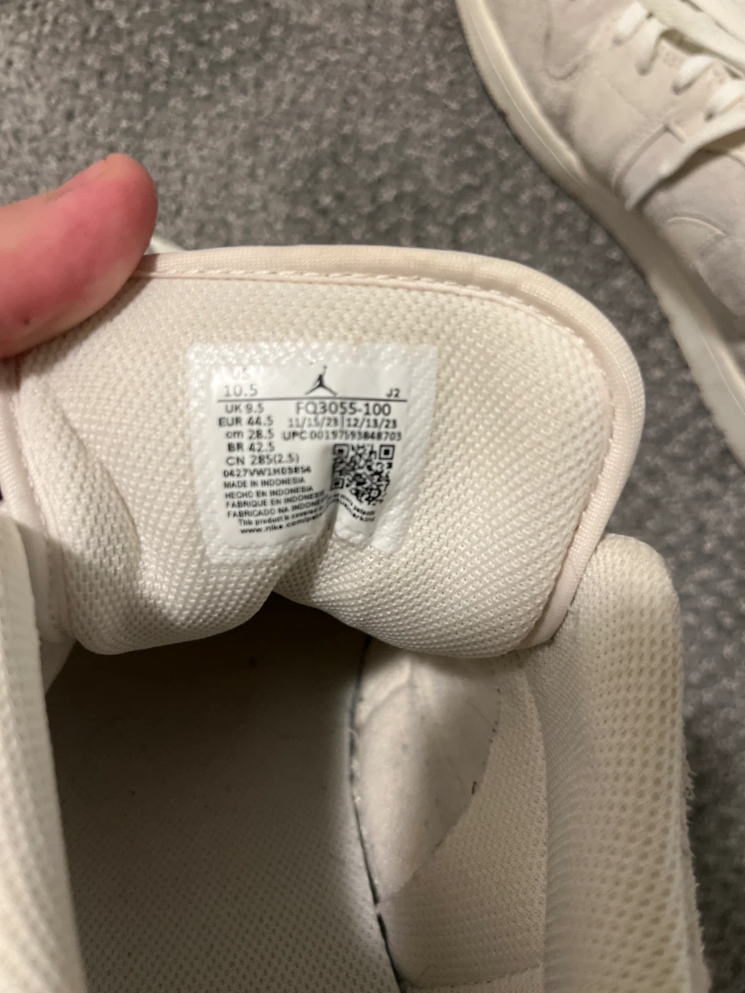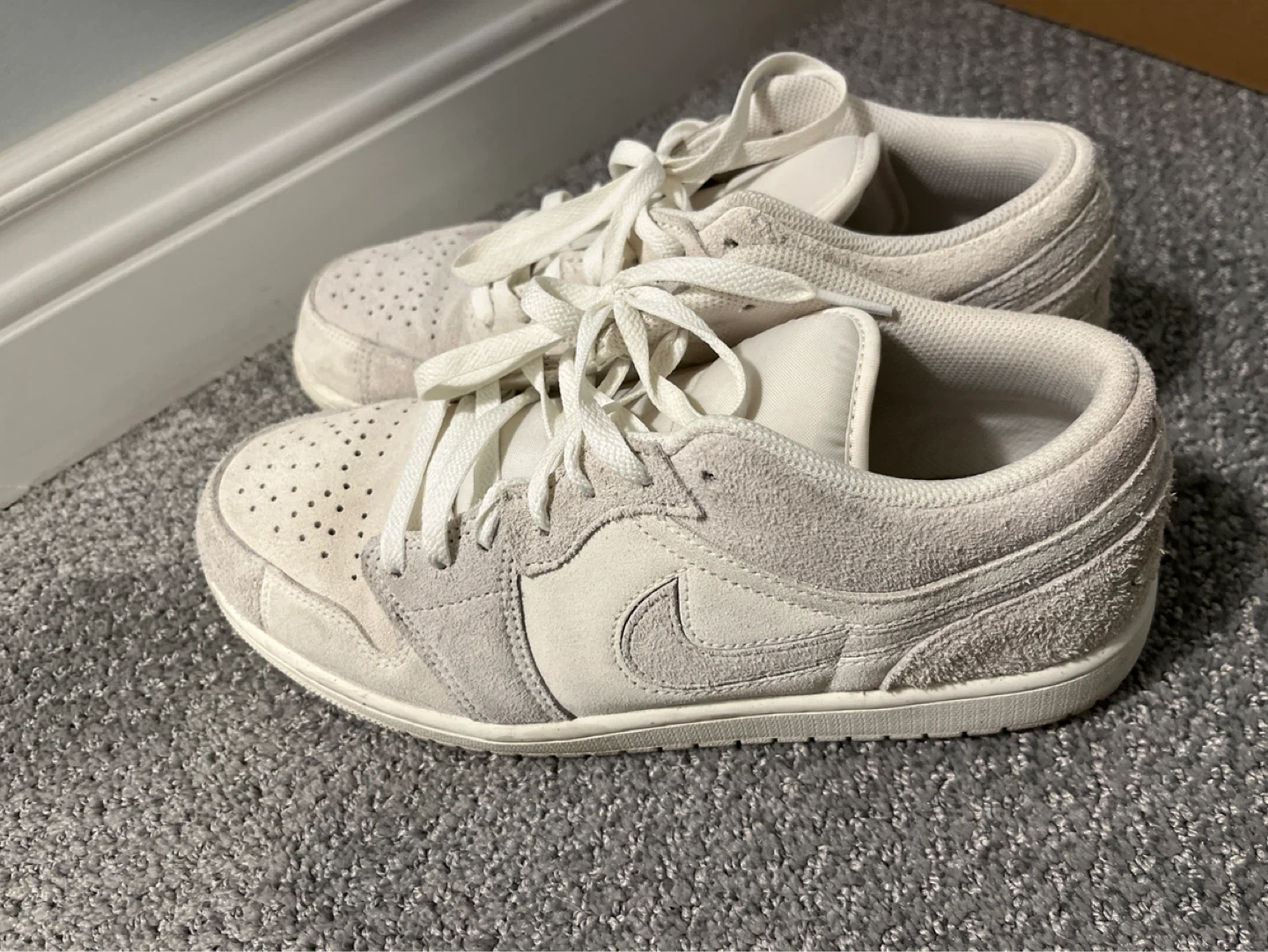 These Jordan 1 Low SE sneakers come in a light beige and white colourway. They feature a suede and leather upper with perforation details on the toe box. Size 10.5. No box