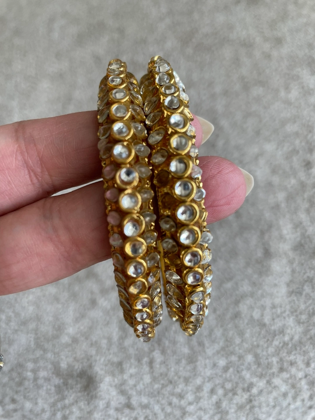 Pair of gold bangles. Adorned with clear stones. Beautiful detail. Perfect for adding a touch of elegance to any outfit.
