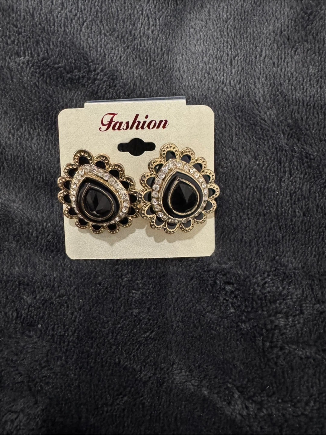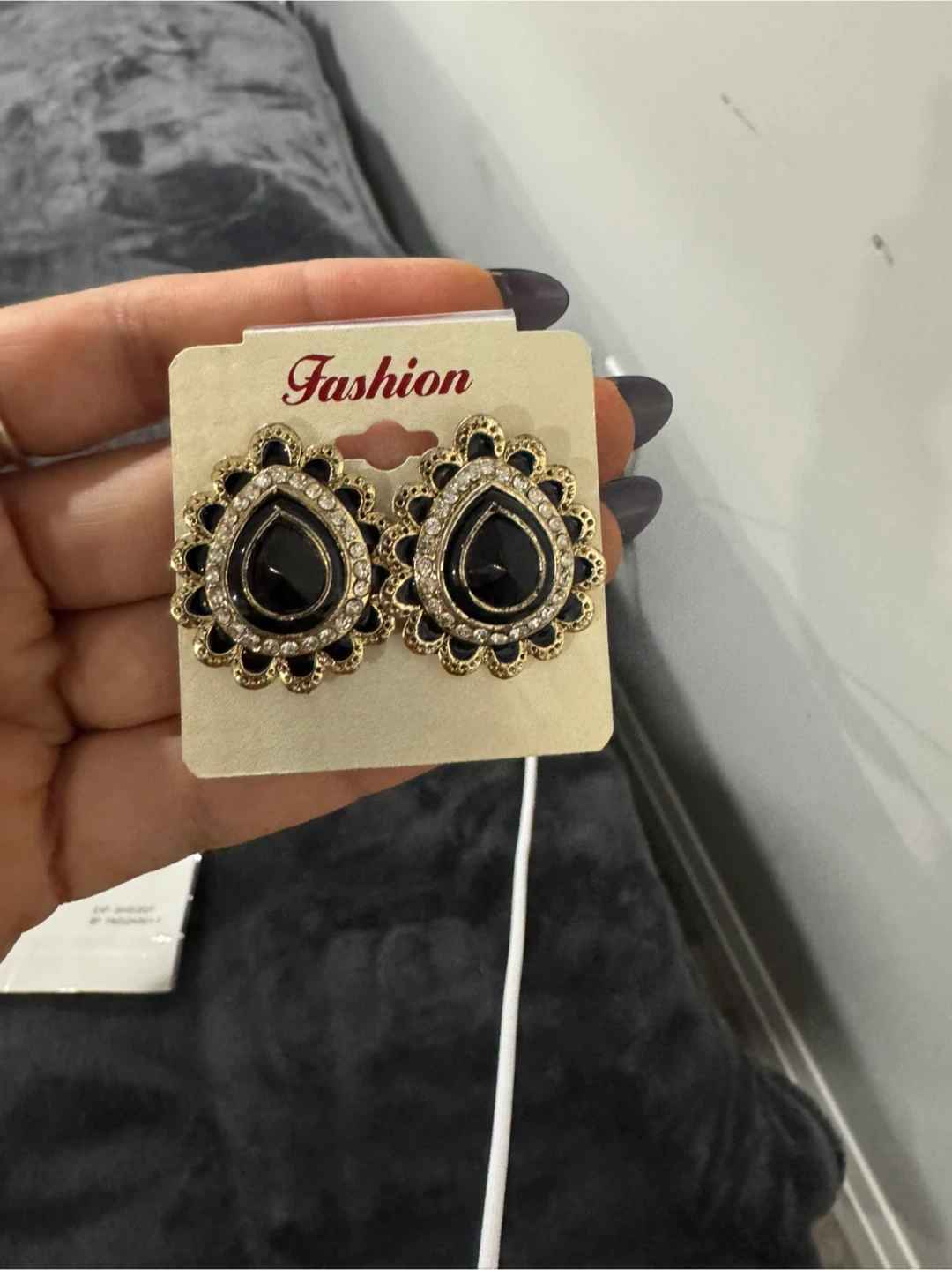 These stylish drop earrings feature a black teardrop-shaped centre surrounded by a decorative gold-toned border with clear rhinestones. These would add a touch of glamour to any outfit!